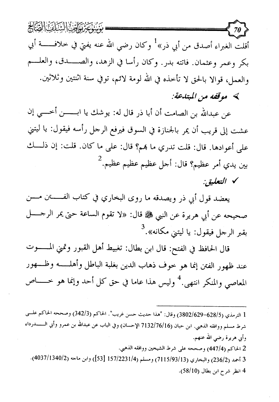 يعضد قول أبي ذر ويصدقه ما روى البخاري في كتاب الفتن من صحيحه عن أبي هريرة عن النبي - صلى الله عليه وسلم - قال: "لا تقوم الساعة حتى يمر الرجل بقبر الرجل فيقول: يا ليتني مكانه". (¬3)