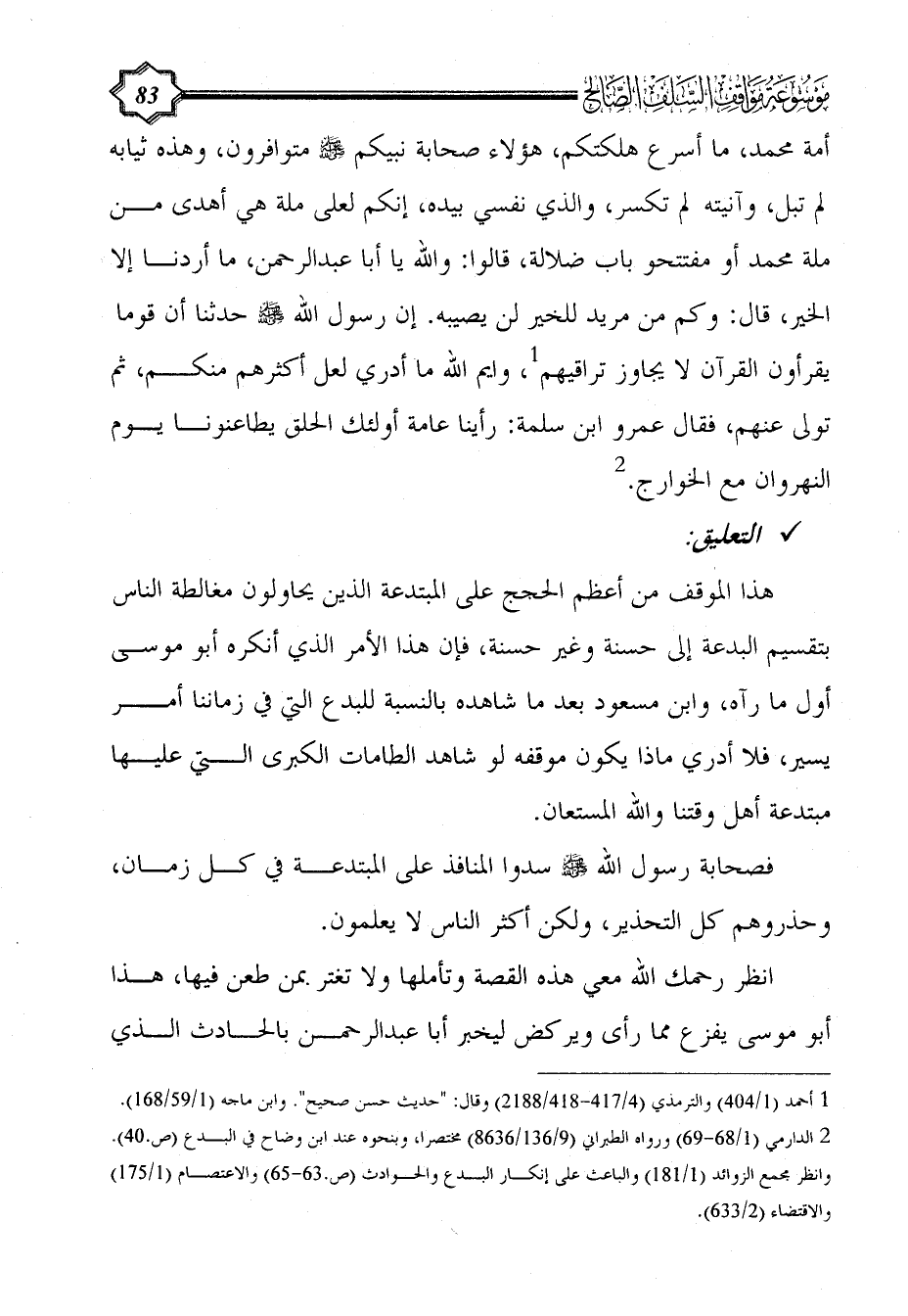 هذا الموقف من أعظم الحجج على المبتدعة الذين يحاولون مغالطة الناس بتقسيم البدعة إلى حسنة وغير حسنة، فإن هذا الأمر الذي أنكره أبو موسى أول ما رآه، وابن مسعود بعد ما شاهده بالنسبة للبدع التي في زماننا أمر يسير، فلا أدري ماذا يكون موقفه لو شاهد الطامات الكبرى التي عليها مبتدعة أهل وقتنا والله المستعان.