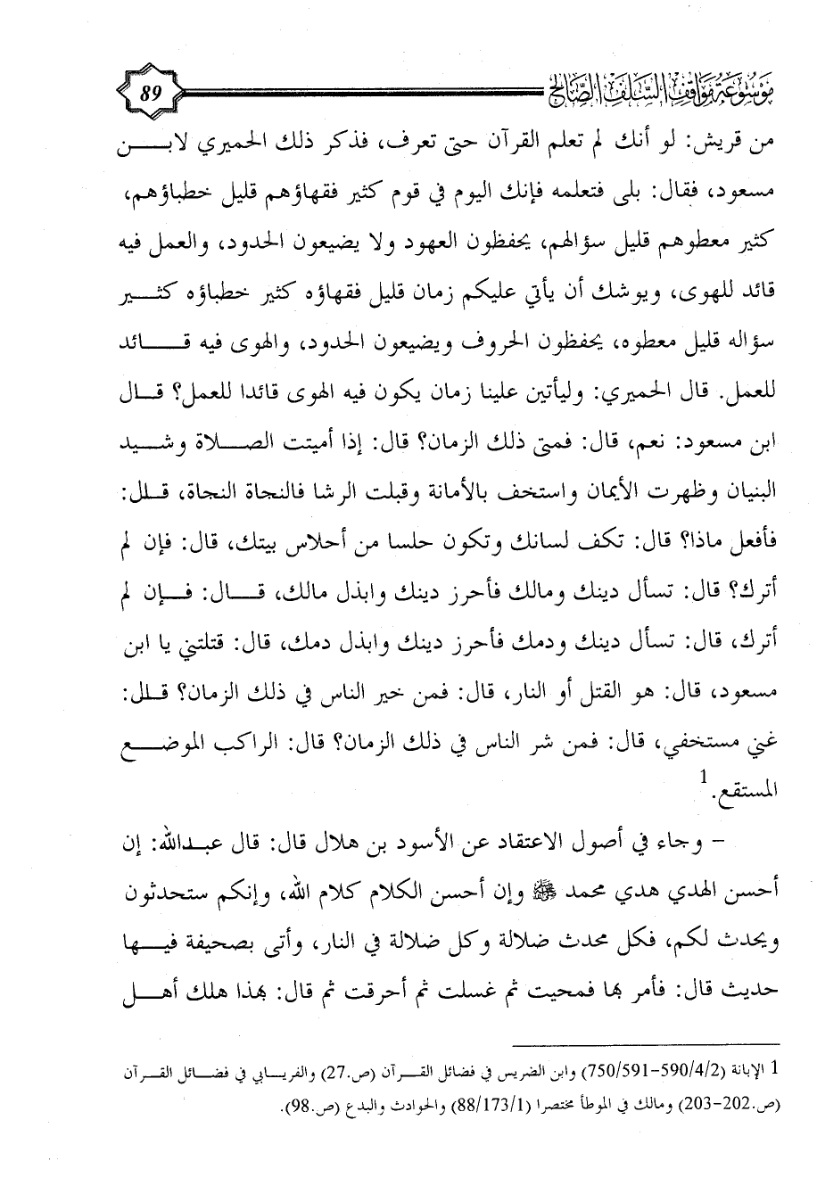 (¬1) الإبانة (2/ 4/590 - 591/ 750) وابن الضريس في فضائل القرآن (ص.27) والفريابي في فضائل القرآن (ص.202 - 203) ومالك في الموطأ مختصرا (1/ 173/88) والحوادث والبدع (ص.98).