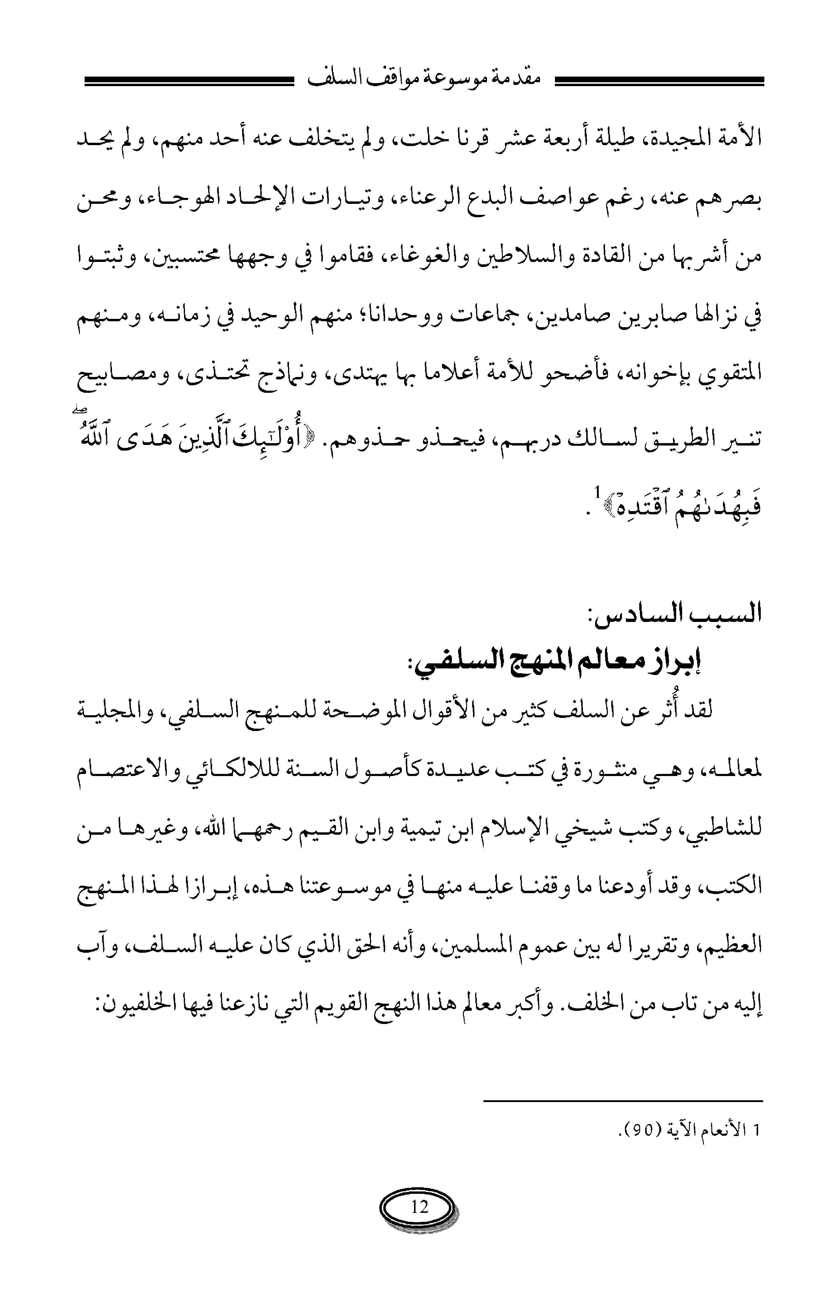 لقد أُثر عن السلف كثير من الأقوال الموضحة للمنهج السلفي، والمجلية لمعالمه، وهي منثورة في كتب عديدة كأصول السنة لللالكائي والاعتصام للشاطبي، وكتب شيخي الإسلام ابن تيمية وابن القيم رحمهما الله، وغيرها من الكتب، وقد أودعنا ما وقفنا عليه منها في موسوعتنا هذه، إبرازاً لهذا المنهج العظيم، وتقريراً له بين عموم المسلمين، وأنه الحق الذي كان عليه السلف، وآب إليه من تاب من الخلف. وأكبر معالم هذا النهج القويم التي نازعنا فيها الخلفيون: