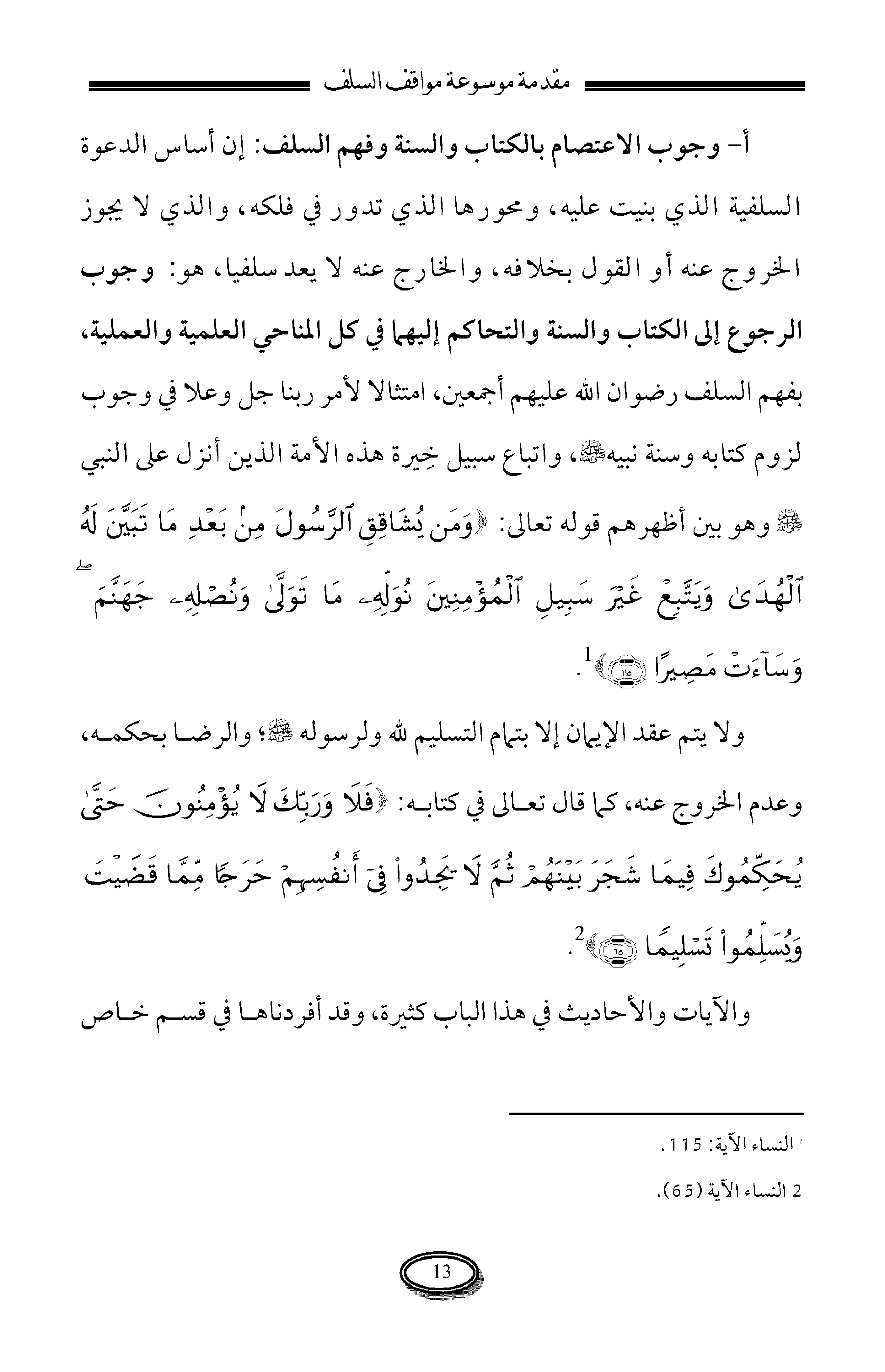 إن أساس الدعوة السلفية الذي بنيت عليه، ومحورها الذي تدور في فلكه، والذي لا يجوز الخروج عنه أو القول بخلافه، والخارج عنه لا يعد سلفياً، هو: وجوب الرجوع إلى الكتاب والسنة والتحاكم إليهما في كل المناحي العلمية والعملية، بفهم السلف رضوان الله عليهم أجمعين، امتثالاً لأمر ربنا جل وعلا في وجوب لزوم كتابه وسنة نبيه - صلى الله عليه وسلم -، واتباع سبيل خِيرة هذه الأمة الذين أنزل على النبي - صلى الله عليه وسلم - وهو بين أظهرهم قوله تعالى: {وَمَنْ يُشَاقِقِ الرَّسُولَ مِنْ بَعْدِ مَا تَبَيَّنَ لَهُ الْهُدَى وَيَتَّبِعْ غَيْرَ سَبِيلِ الْمُؤْمِنِينَ نُوَلِّهِ مَا تَوَلَّى وَنُصْلِهِ جَهَنَّمَ وَسَاءَتْ مَصِيرًا (115)} (¬1).