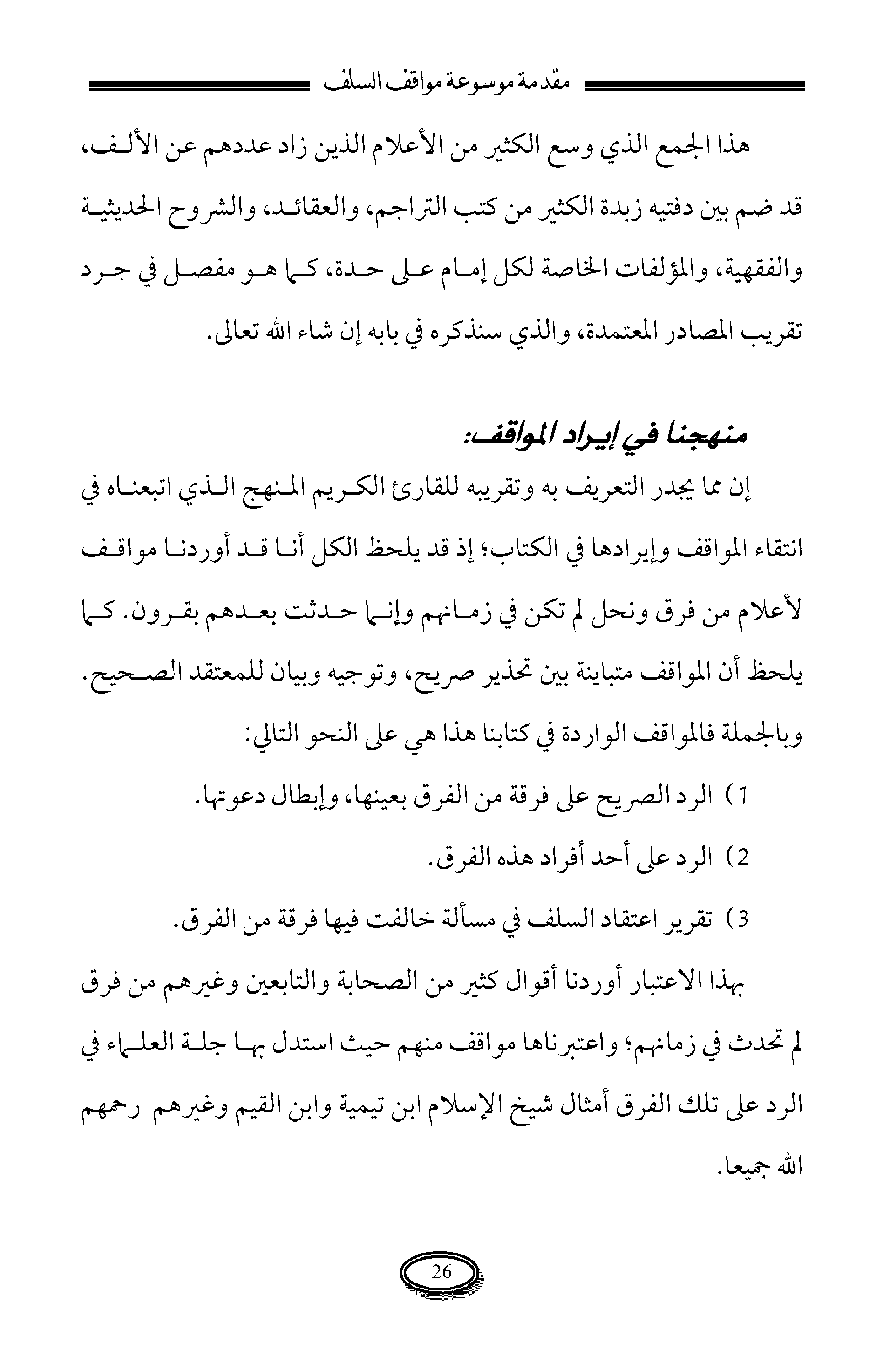 إن مما يجدر التعريف به وتقريبه للقارئ الكريم المنهج الذي اتبعناه في انتقاء المواقف وإيرادها في الكتاب؛ إذ قد يلحظ الكل أنا قد أوردنا مواقف لأعلام من فرق ونحل لم تكن في زمانهم وإنما حدثت بعدهم بقرون. كما يلحظ أن المواقف متباينة بين تحذير صريح، وتوجيه وبيان للمعتقد الصحيح.