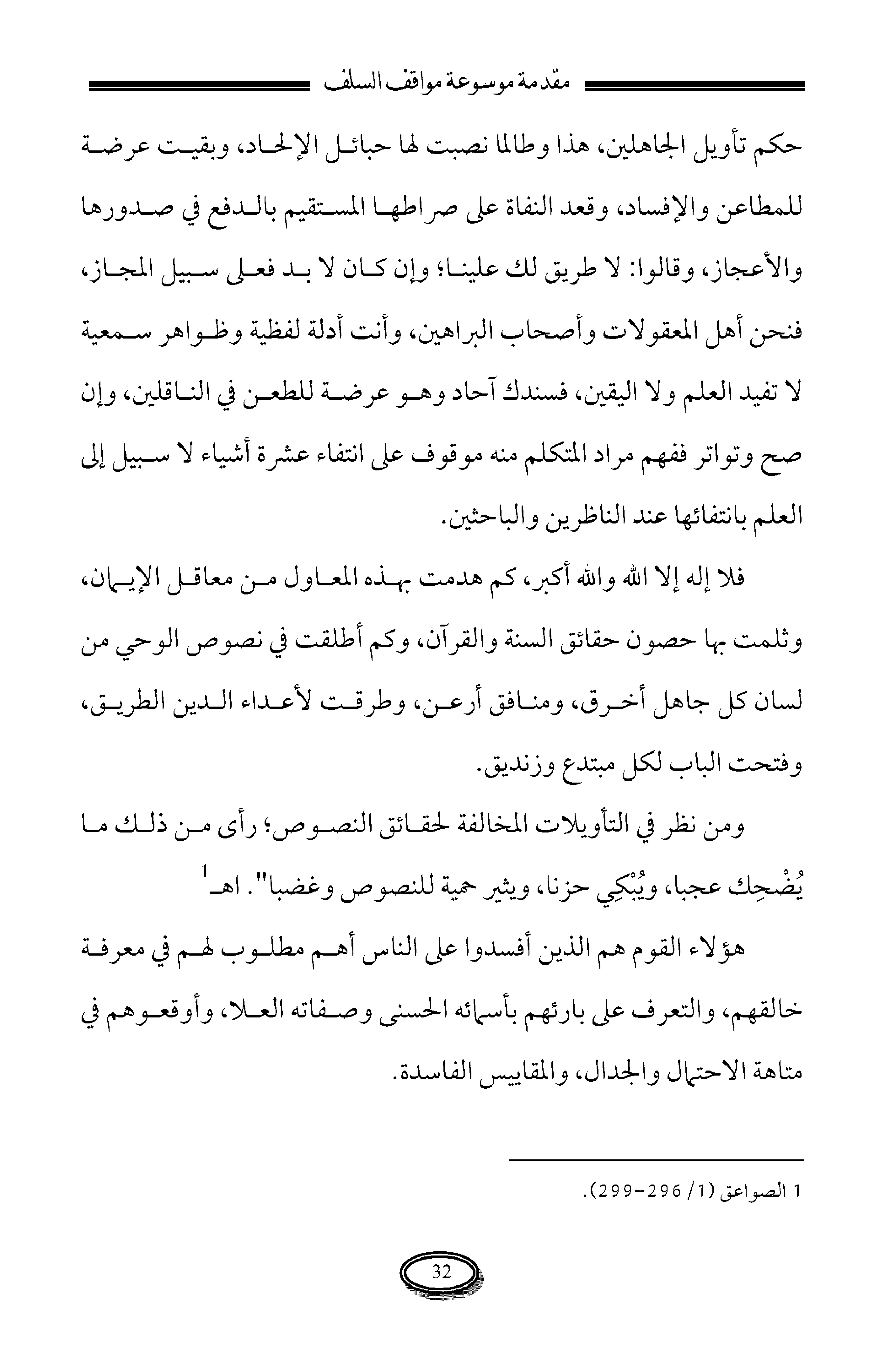 حكم تأويل الجاهلين، هذا وطالما نصبت لها حبائل الإلحاد، وبقيت عرضة للمطاعن والإفساد، وقعد النفاة على صراطها المستقيم بالدفع في صدورها والأعجاز، وقالوا: لا طريق لك علينا؛ وإن كان لا بد فعلى سبيل المجاز، فنحن أهل المعقولات وأصحاب البراهين، وأنت أدلة لفظية وظواهر سمعية لا تفيد العلم ولا اليقين، فسندك آحاد وهو عرضة للطعن في الناقلين، وإن صح وتواتر ففهم مراد المتكلم منه موقوف على انتفاء عشرة أشياء لا سبيل إلى العلم بانتفائها عند الناظرين والباحثين.