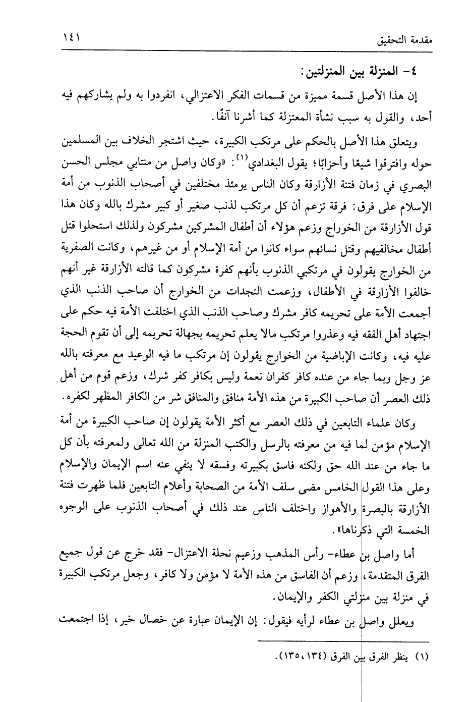أما واصل بن عطاء -رأس المذهب وزعيم نحلة الاعتزال- فقد خرج عن قول جميع الفرق المتقدمة، وزعم أن الفاسق من هذه الأمة لا مؤمن ولا كافر، وجعل مرتكب الكبيرة في منزلة بين منزلتي الكفر والإيمان.