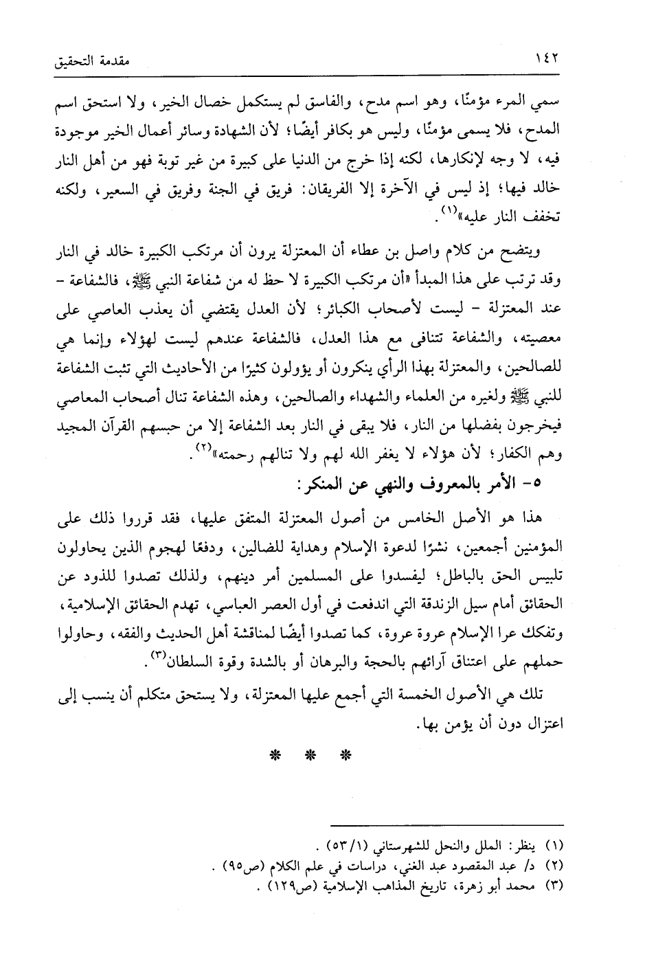 هذا هو الأصل الخامس من أصول المعتزلة المتفق عليها، فقد قرروا ذلك على المؤمنين أجمعين، نشرًا لدعوة الإسلام وهداية للضالين، ودفعًا لهجوم الذين يحاولون تلبيس الحق بالباطل؛ ليفسدوا على المسلمين أمر دينهم، ولذلك تصدوا للذود عن الحقائق أمام سيل الزندقة التي اندفعت في أول العصر العباسي، تهدم الحقائق الإسلامية، وتفكك عرا الإسلام عروة عروة، كما تصدوا أيضًا لمناقشة أهل الحديث والفقه، وحاولوا حملهم على اعتناق آرائهم بالحجة والبرهان أو بالشدة وقوة السلطان.