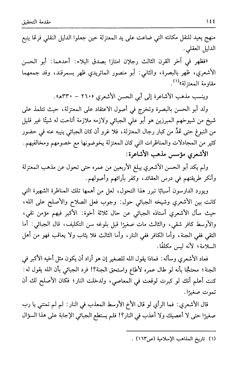 " فظهر في آخر القرن الثالث رجلان امتازا بصدق البلاء: أحدهما: أبو الحسن الأشعري، ظهر بالبصرة، والثاني: أبو منصور الماتريدي ظهر بسمرقند، وقد جمعهما مقاومة المعتزلة ".