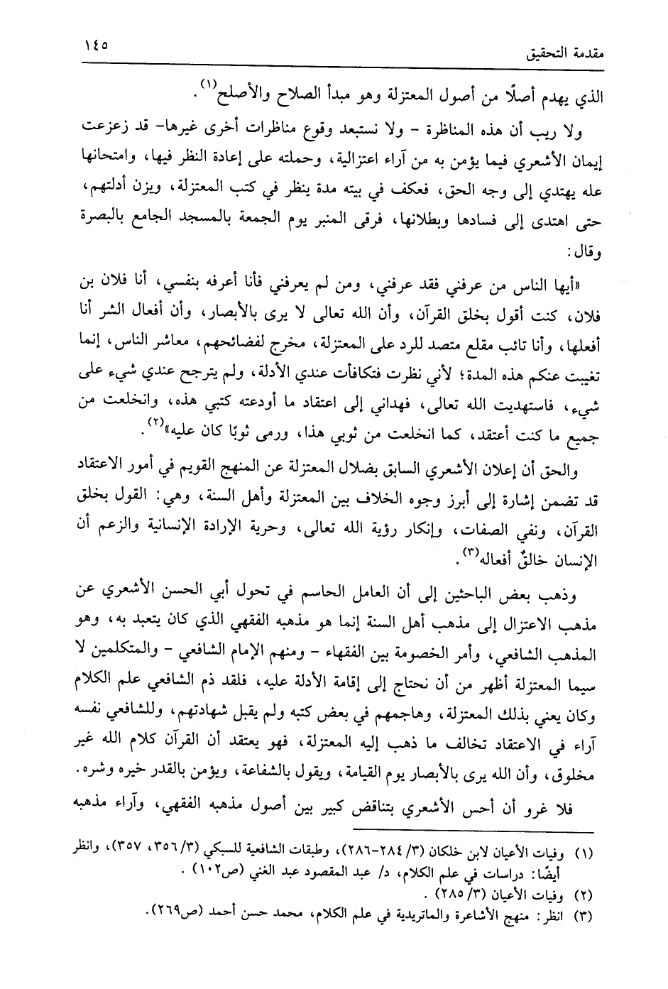 " أيها الناس من عرفني فقد عرفني، ومن لم يعرفني فأنا أعرفه بنفسي، أنا فلان بن فلان، كنت أقول بخلق القرآن، وأن اللَّه تعالى لا يُرى بالأبصار، وأن أفعال الشر أنا أفعلها، وأنا تائب مقلع متصد للرد على المعتزلة، مخرج لفضائحهم، معاشر الناس، إنما تغيبت عنكم هذه المدة؛ لأني نظرت فتكافأت عندي الأدلة، ولم يترجح عندي شيء على شيء، فاستهديت اللَّه تعالى، فهداني إلى اعتقاد ما أودعته كتبي هذه، وانخلعت من جميع ما كنت أعتقد، كما انخلعت من ثوبي هذا، ورمى ثوبًا كان عليه ".