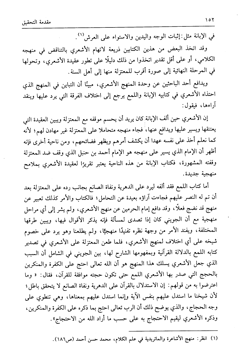 ويدافع أحد الباحثين عن وحدة المنهج الأشعري، مبينًا أن التباين في المنهج الذي احتذاه الأشعري في كتابيه الإبانة واللمع يرجع إلى اختلاف الفرقة التي يرد عليها وينقد آراءها، فيقول: