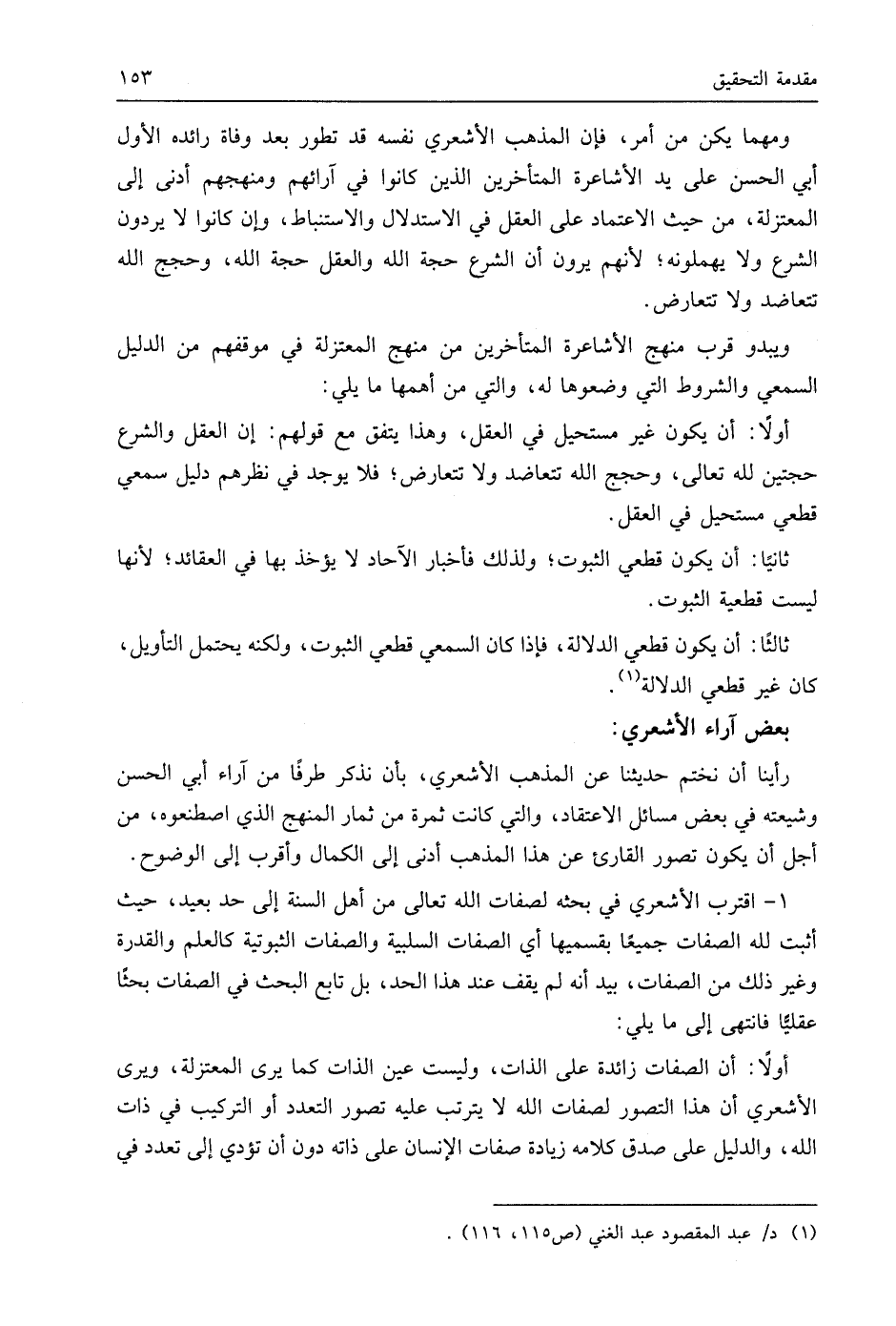 ومهما يكن من أمر، فإن المذهب الأشعري نفسه قد تطور بعد وفاة رائده الأول أبي الحسن على يد الأشاعرة المتأخرين الذين كانوا في آرائهم ومنهجهم أدنى إلى المعتزلة، من حيث الاعتماد على العقل في الاستدلال والاستنباط، وإن كانوا لا يردون الشرع ولا يهملونه؛ لأنهم يرون أن الشرع حجة اللَّه والعقل حجة اللَّه، وحجج الله تتعاضد ولا تتعارض.