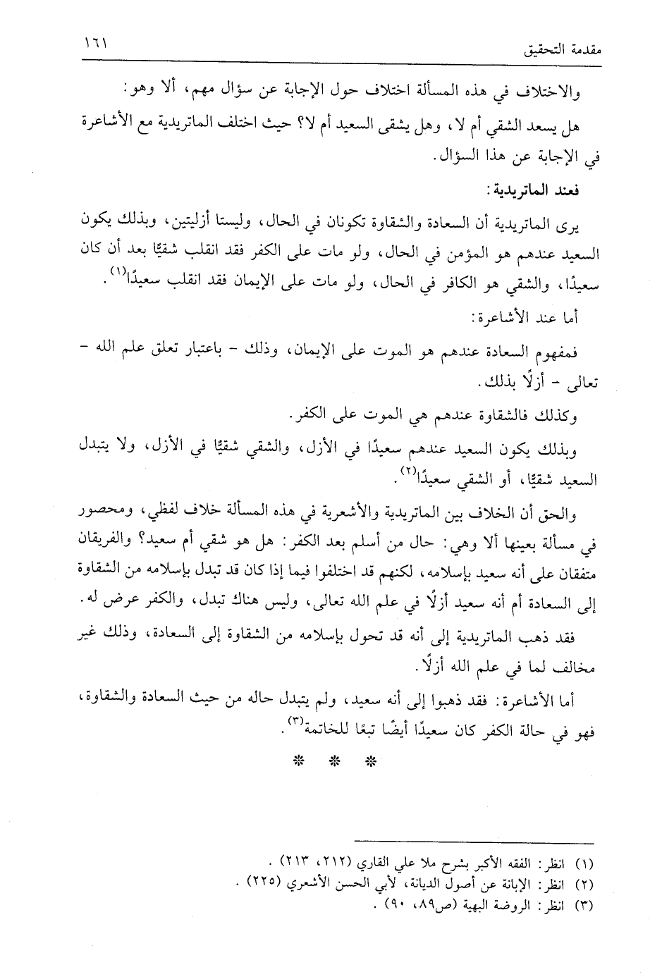 والحق أن الخلاف بين الماتريدية والأشعرية في هذه المسألة خلاف لفظي، ومحصور في مسألة بعينها ألا وهي: حال من أسلم بعد الكفر: هل هو شقي أم سعيد؟ والفريقان متفقان على أنه سعيد بإسلامه، لكنهم قد اختلفوا فيما إذا كان قد تبدل بإسلامه من الشقاوة إلى السعادة أم أنه سعيد أزلًا في علم اللَّه تعالى، وليس هناك تبدل، والكفر عرض له.