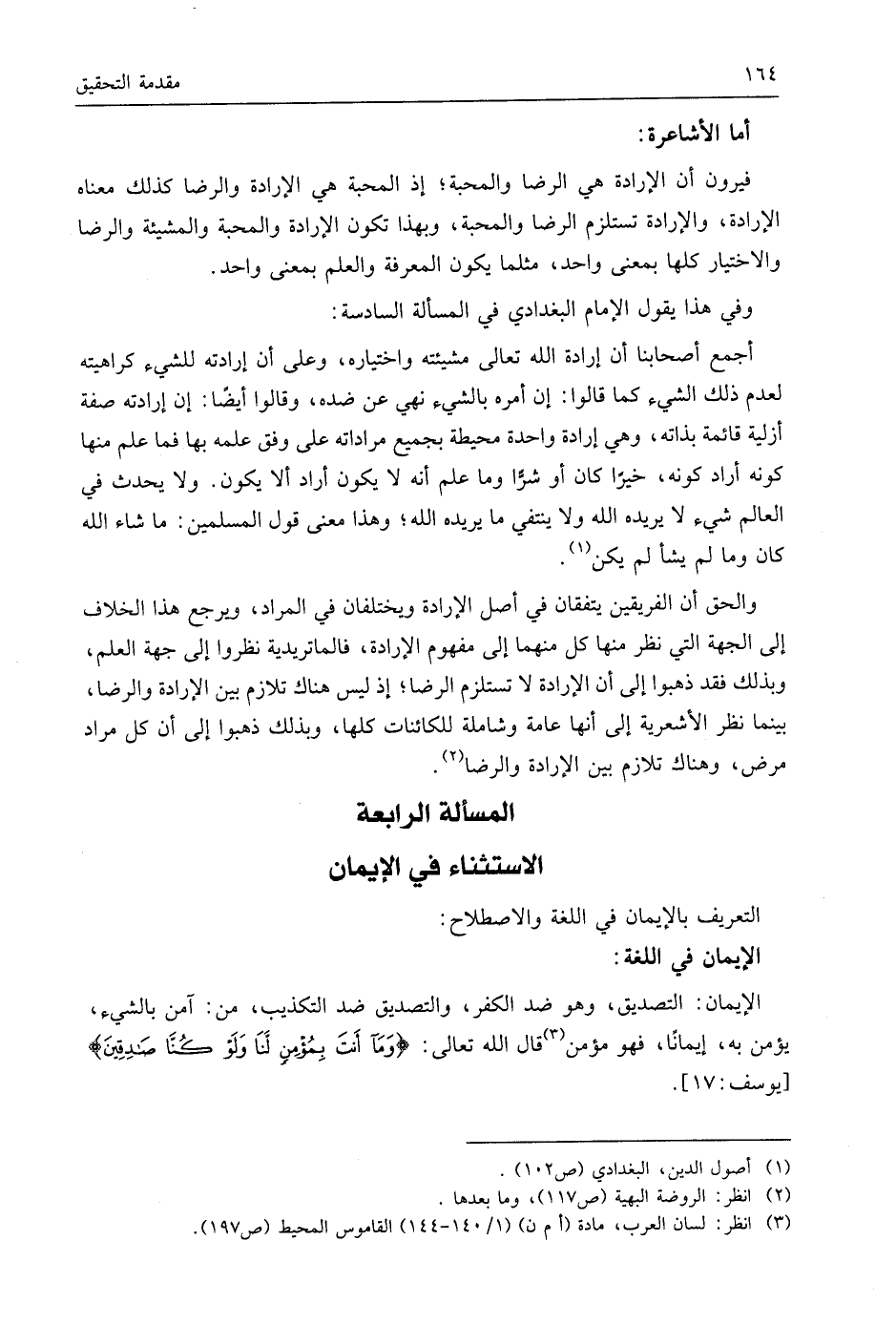 فيرون أن الإرادة هي الرضا والمحبة؛ إذ المحبة هي الإرادة والرضا كذلك معناه الإرادة، والإرادة تستلزم الرضا والمحبة، وبهذا تكون الإرادة والمحبة والمشيئة والرضا والاختيار كلها بمعنى واحد، مثلما يكون المعرفة والعلم بمعنى واحد.