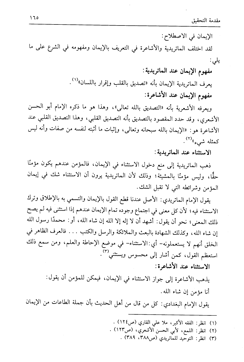 يقول الإمام الماتريدي: الأصل عندنا قطع القول بالإيمان والتسمي به بالإطلاق وترك الاستثناء فيه؛ لأن كل معنى في اجتماع وجوده تمام الإيمان عندهم إذا استثنى فيه لم يصح ذلك المعنى؛ نحو أن يقول: أشهد أن لَا إِلَهَ إِلَّا اللَّهُ إن شاء اللَّه، أو: محمدًا رسول الله إن شاء اللَّه، وكذلك الشهادة بالبعث والملائكة والرسل والكتب. . . فالعرف الظاهر في الخلق أنهم لا يستعملونه -أي: الاستثناء- في موضع الإحاطة والعلم، ومن سمع ذلك استعظم القول، كمن أشار إلى محسوس ويستثني.
