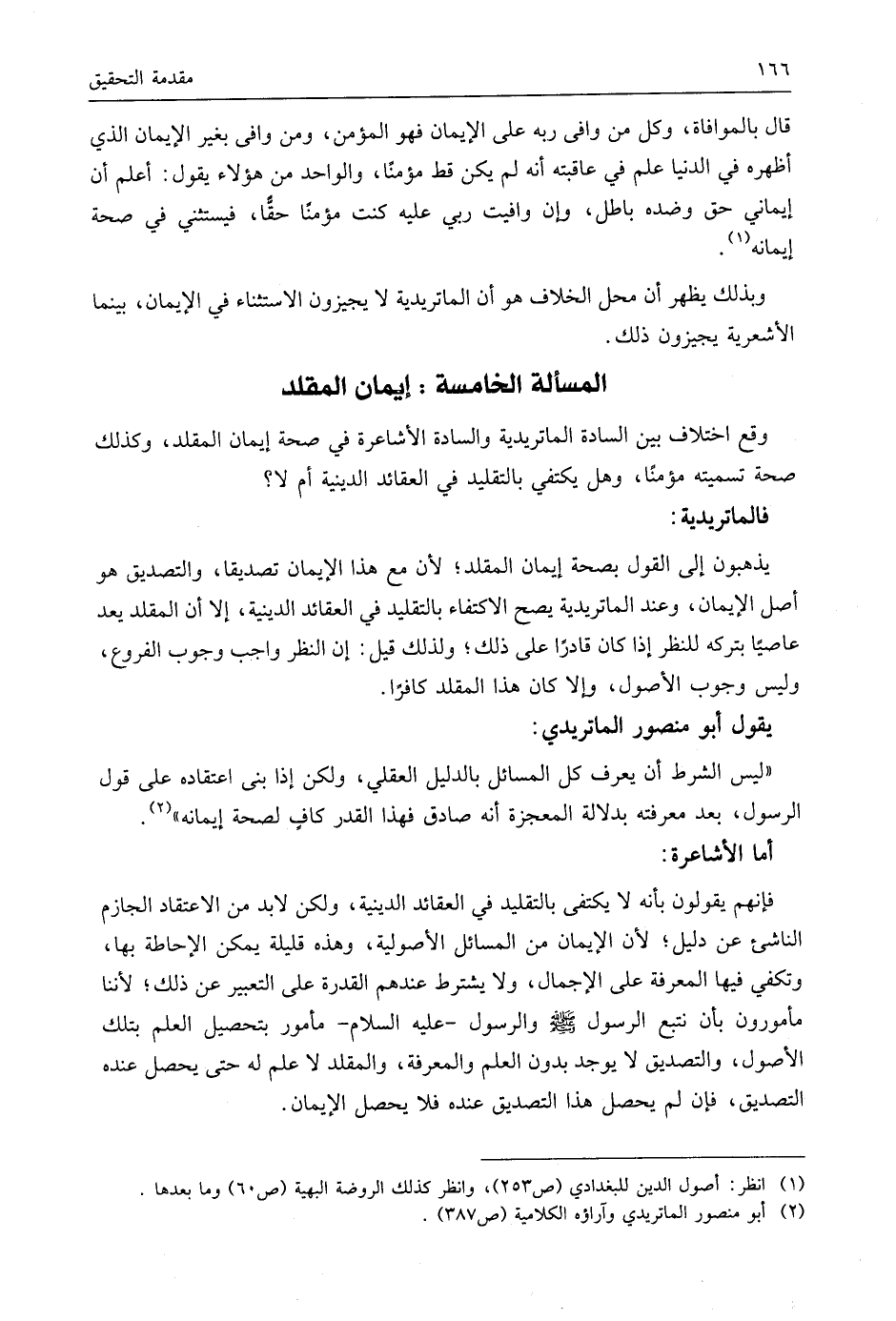 فإنهم يقولون بأنه لا يكتفى بالتقليد في العقائد الدِّينية، ولكن لابد من الاعتقاد الجازم الناشئ عن دليل؛ لأن الإيمان من المسائل الأصولية، وهذه قليلة يمكن الإحاطة بها، وتكفي فيها المعرفة على الإجمال، ولا يشترط عندهم القدرة على التعبير عن ذلك؛ لأننا مأمورون بأن نتبع الرسول - صَلَّى اللَّهُ عَلَيهِ وَسَلَّمَ - والرسول - عليه السلام - مأمور بتحصيل العلم بتلك الأصول، والتصديق لا يوجد بدون العلم والمعرفة، والمقلد لا علم له حتى يحصل عنده التصديق، فإن لم يحصل هذا التصديق عنده فلا يحصل الإيمان.