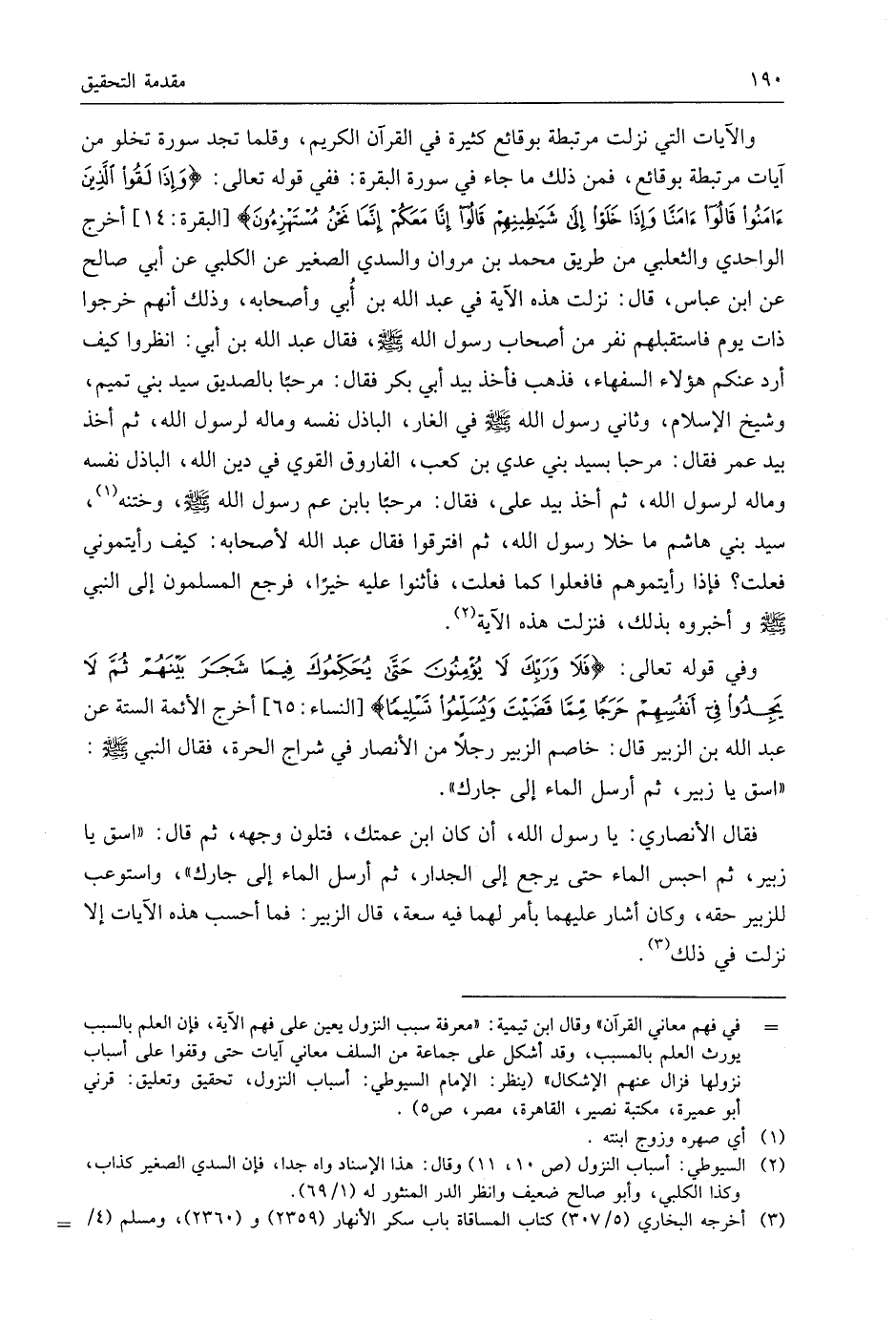 والآيات التي نزلت مرتبطة بوقائع كثيرة في القرآن الكريم، وقلما تجد سورة تخلو من آيات مرتبطة بوقائع، فمن ذلك ما جاء في سورة البقرة: ففي قوله تعالى: {وَإِذَا لَقُوا الَّذِينَ آمَنُوا قَالُوا آمَنَّا وَإِذَا خَلَوْا إِلَى شَيَاطِينِهِمْ قَالُوا إِنَّا مَعَكُمْ إِنَّمَا نَحْنُ مُسْتَهْزِئُونَ}، أخرج الواحدي والثعلبي من طريق مُحَمَّد بن مروان والسدي الصغير عن الكلبي عن أبي صالح عن ابن عَبَّاسٍ، قال: نزلت هذه الآية في عبد اللَّه بن أُبي وأصحابه، وذلك أنهم خرجوا ذات يوم فاستقبلهم نفر من أصحاب رسول اللَّه - صَلَّى اللَّهُ عَلَيهِ وَسَلَّمَ -، فقال عبد اللَّه بن أُبي: انظروا كيف أرد عنكم هَؤُلَاءِ السفهاء، فذهب فأخذ بيد أبي بكر فقال: مرحبًا بالصديق سيد بني تميم، وشيخ الإسلام، وثاني رسول اللَّه - صَلَّى اللَّهُ عَلَيهِ وَسَلَّمَ - في الغار، الباذل نفسه وماله لرسول اللَّه، ثم أخذ بيد عمر فقال: مرحبا بسيد بني عدي بن كعب، الفاروق القوي في دين اللَّه، الباذل نفسه وماله لرسول اللَّه، ثم أخذ بيد عليٍّ، فقال: مرحبًا بابن عم رسول اللَّه - صَلَّى اللَّهُ عَلَيهِ وَسَلَّمَ -، وختنه، سيد بني هاشم ما خلا رسول اللَّه، ثم افترقوا فقال عبد اللَّه لأصحابه: كيف رأيتموني فعلت؟ فإذا رأيتموهم فافعلوا كما فعلت، فأثنوا عليه خيرًا، فرجع المسلمون إلى النبي - صَلَّى اللَّهُ عَلَيهِ وَسَلَّمَ - وأخبروه بذلك، فنزلت هذه الآية.