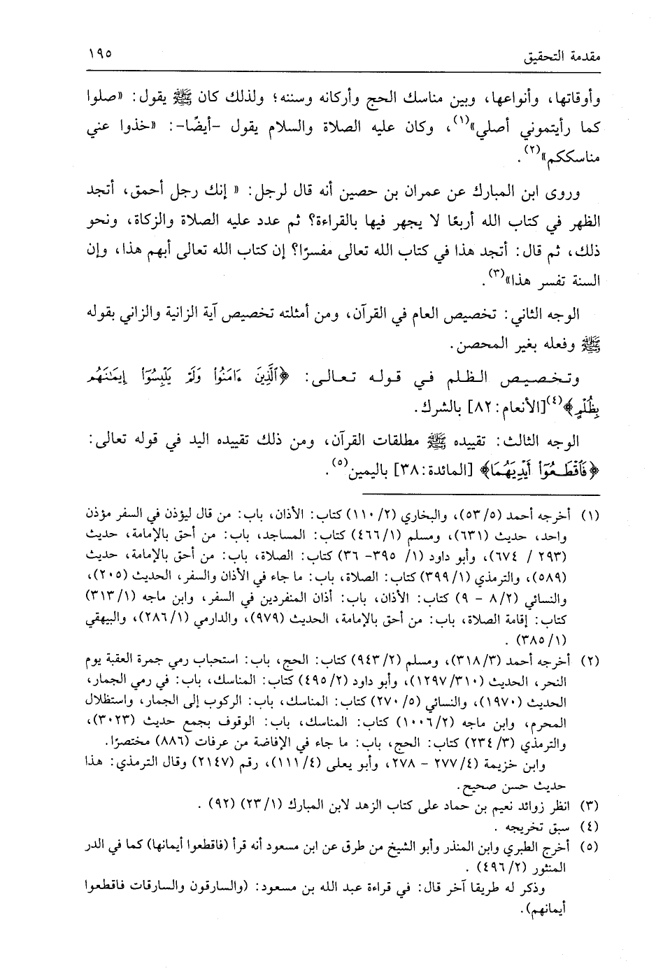 وروى ابن المبارك عن عمران بن حصين أنه قال لرجل: " إنك رجل أحمق، أتجد الظهر في كتاب اللَّه أربعًا لا يجهر فيها بالقراءة؟ ثم عدد عليه الصلاة والزكاة، ونحو ذلك، ثم قال: أتجد هذا في كتاب اللَّه تعالى مفسرًا؛ إن كتاب اللَّه تعالى أبهم هذا، وإن السنة تفسر هذا ".