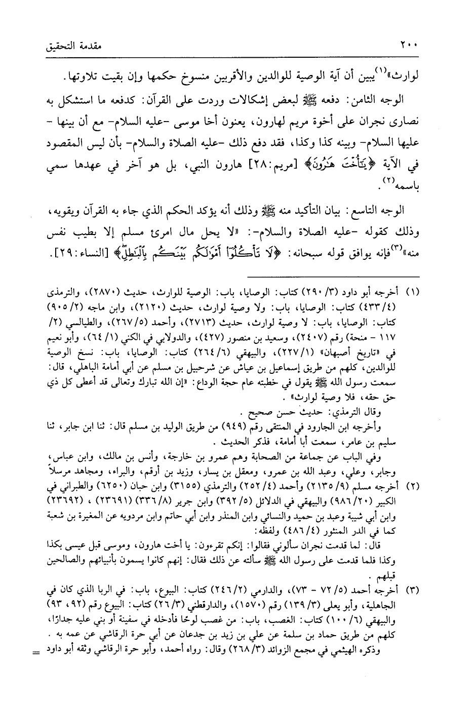 الوجه التاسع: بيان التأكيد منه - صَلَّى اللَّهُ عَلَيهِ وَسَلَّمَ - وذلك أنه يؤكد الحكم الذي جاء به القرآن ويقويه، وذلك كقوله - عليه الصلاة والسلام -: " لا يحل مال امرئ مسلم إلا بطيب نفس منه " فإنه يوافق قوله سبحانه: (لَا تَأْكُلُوا أَمْوَالَكُمْ بَيْنَكُمْ بِالْبَاطِلِ).
