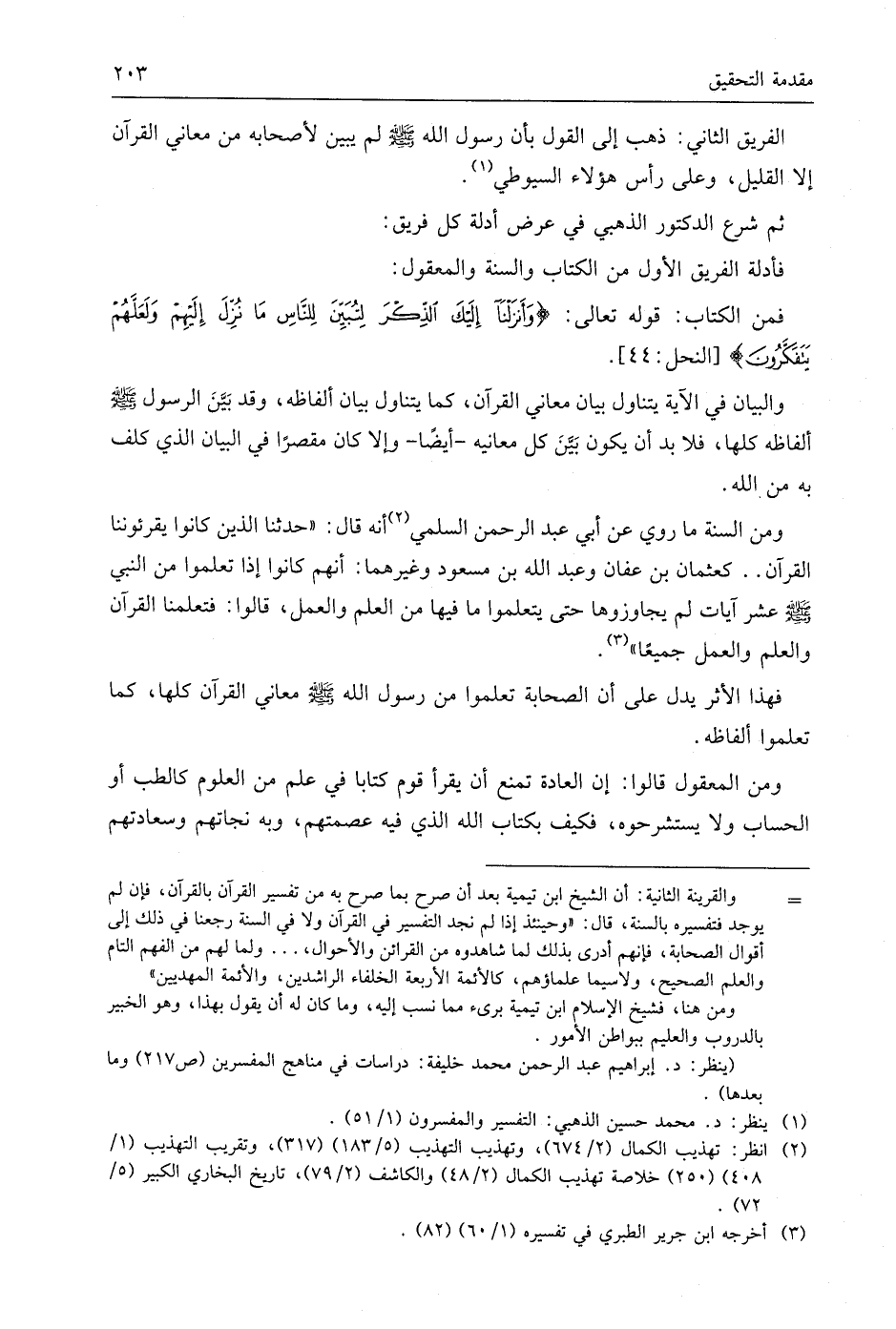 الفريق الثاني: ذهب إلى القول بأن رسول اللَّه - صَلَّى اللَّهُ عَلَيهِ وَسَلَّمَ - لم يبين لأصحابه من معاني القرآن إلا القليل، وعلى رأس هَؤُلَاءِ السيوطي.