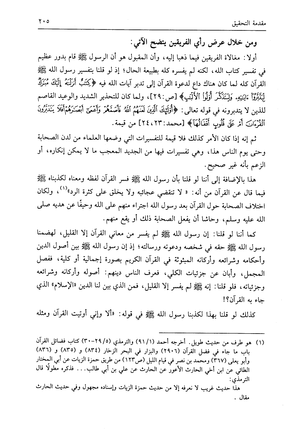 أولا: مغالاة الفريقين فيما ذهبا إليه، وأن المقبول هو أن الرسول - صَلَّى اللَّهُ عَلَيهِ وَسَلَّمَ - قام بدور عظيم في تفسير كتاب اللَّه، لكنه لم يفسره كله بطبيعة الحال؛ إذ لو قلنا بتفسير رسول اللَّه - صَلَّى اللَّهُ عَلَيهِ وَسَلَّمَ - القرآن كله لما كان هناك داع لدعوة القرآن إلى تدبر آيات اللَّه فيه (كِتَابٌ أَنْزَلْنَاهُ إِلَيْكَ مُبَارَكٌ لِيَدَّبَّرُوا آيَاتِهِ وَلِيَتَذَكَّرَ أُولُو الْأَلْبَابِ)، ولما كان للتحذير الشديد والوعيد القاصم للذين لا يتدبرونه في قوله تعالى: (أُولَئِكَ الَّذِينَ لَعَنَهُمُ اللَّهُ فَأَصَمَّهُمْ وَأَعْمَى أَبْصَارَهُمْ (23) أَفَلَا يَتَدَبَّرُونَ الْقُرْآنَ أَمْ عَلَى قُلُوبٍ أَقْفَالُهَا)، من قيمة.