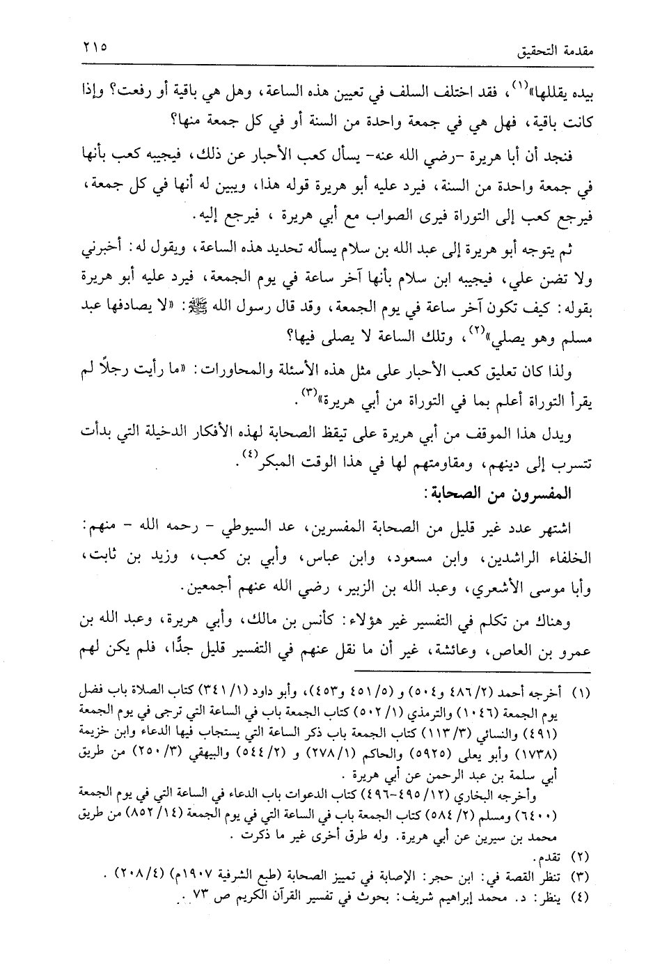 فنجد أن أبا هريرة - رَضِيَ اللَّهُ عَنْهُ - يسأل كعب الأحبار عن ذلك، فيجيبه كعب بأنها في جمعة واحدة من السنة، فيرد عليه أبو هريرة قوله هذا، ويبين له أنها في كل جمعة، فيرجع كعب إلى التوراة فيرى الصواب مع أبي هريرة، فيرجع إليه.