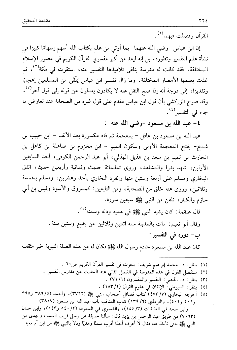 إن ابن عَبَّاسٍ - رضي اللَّه عنهما - بما أوتي من علم بكتاب اللَّه أسهم إسهامًا كبيرًا في نشأة علم التفسير وتطوره، بل إنه ليعد من أكبر مفسري القرآن الكريم في عصور الإسلام المختلفة، فقد كانت له مدرسة يتلقى تلاميذها التفسير عنه، استقرت في مكة، ثم غذت بعلمها الأمصار المختلفة، وما زال تفسير ابن عَبَّاسٍ يَلْقَى من المسلمين إعجابًا وتقديرًا، إلى درجة أنه إذا صح النقل عنه لا يكادون يعدلون عن قوله إلى قول آخر، وقد صرح الزركشي بأن قول ابن عَبَّاسٍ مقدم على قول غيره من الصحابة عند تعارض ما جاء في التفسير.