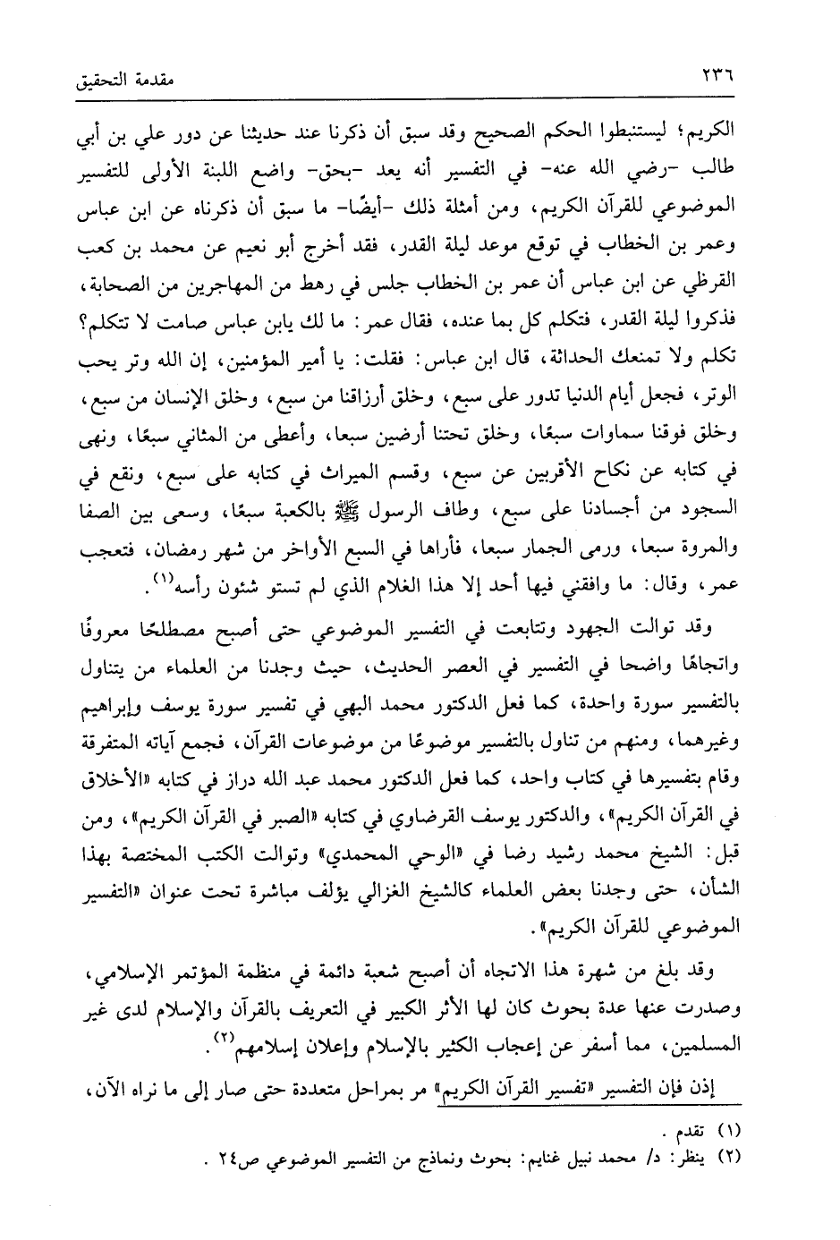 الكريم؛ ليستنبطوا الحكم الصحيح وقد سبق أن ذكرنا عند حديثنا عن دور علي بن أبي طالب - رَضِيَ اللَّهُ عَنْهُ - في التفسير أنه يعد -بحق- واضع اللبنة الأولى للتفسير الموضوعي للقرآن الكريم، ومن أمثلة ذلك -أيضًا- ما سبق أن ذكرناه عن ابن عَبَّاسٍ وعمر بن الخطاب في توقع موعد ليلة القدر، فقد أخرج أبو نعيم عن مُحَمَّد بن كعب القرظي عن ابن عَبَّاسٍ أن عمر بن الخطاب جلس في رهط من المهاجرين من الصحابة، فذكروا ليلة القدر، فتكلم كل بما عنده، فقال عمر: ما لك يا ابن عَبَّاسٍ صامت لا تتكلم؟ تكلم ولا تمنعك الحداثة، قال ابن عَبَّاسٍ: فقلت: يا أمير المؤمنين، إن اللَّه وتر يحب الوتر، فجعل أيام الدنيا تدور على سبع، وخلق أرزاقنا من سبع، وخلق الإنسان من سبع، وخلق فوقنا سماوات سبعًا، وخلق تحتنا أرضين سبعا، وأعطى من المثاني سبعًا، ونهى في كتابه عن نكاح الأقربين عن سبع، وقسم الميراث في كتابه على سبع، ونقع في السجود من أجسادنا على سبع، وطاف الرسول - صَلَّى اللَّهُ عَلَيهِ وَسَلَّمَ - بالكعبة سبعًا، وسعى بين الصفا والمروة سبعا، ورمى الجمار سبعا، فأراها في السبع الأواخر من شهر رمضان، فتعجب عمر، وقال: ما وافقني فيها أحد إلا هذا الغلام الذي لم تستو شئون رأسه.