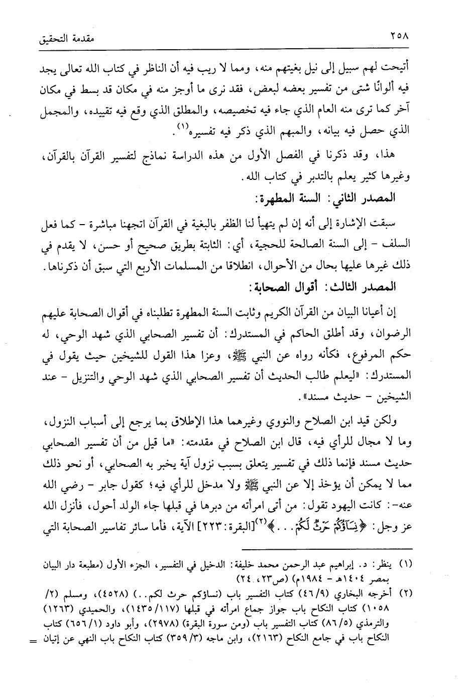 ولكن قيد ابن الصلاح والنووي وغيرهما هذا الإطلاق بما يرجع إلى أسباب النزول، وما لا مجال للرأي فيه، قال ابن الصلاح في مقدمته: " ما قيل من أن تفسير الصحابي حديث مسند فإنما ذلك في تفسير يتعلق بسبب نزول آية يخبر به الصحابي، أو نحو ذلك مما لا يمكن أن يؤخذ إلا عن النبي - صَلَّى اللَّهُ عَلَيهِ وَسَلَّمَ - ولا مدخل للرأي فيه؛ كقول جابر - رضي الله عنه -: كانت اليهود تقول: من أتى امرأته من دبرها في قبلها جاء الولد أحول، فأنزل الله عَزَّ وَجَلَّ: (نِسَاؤُكُمْ حَرْثٌ لَكُمْ. . .)، الآية، فأما سائر تفاسير الصحابة التي