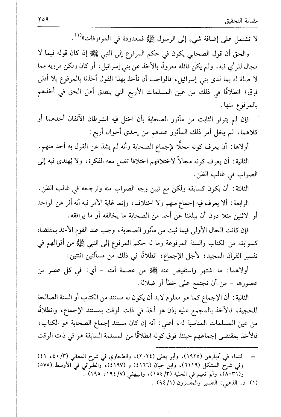 والحق أن قول الصحابي يكون في حكم المرفوع إلى النبي - صَلَّى اللَّهُ عَلَيهِ وَسَلَّمَ - إذا كان قوله فيما لا مجال للرأي فيه، ولم يكن قائله معروفًا بالأخذ عن بني إسرائيل، أو كان ولكن مرويه مما لا صلة له بما لدى بني إسرائيل، فالواجب أن نأخذ بهذا القول أخذنا بالمرفوع بلا أدنى فرق؛ انطلاقًا في ذلك من عين المسلمات الأربع التي ينطلق أهل الحق في أخذهم بالمرفوع منها.