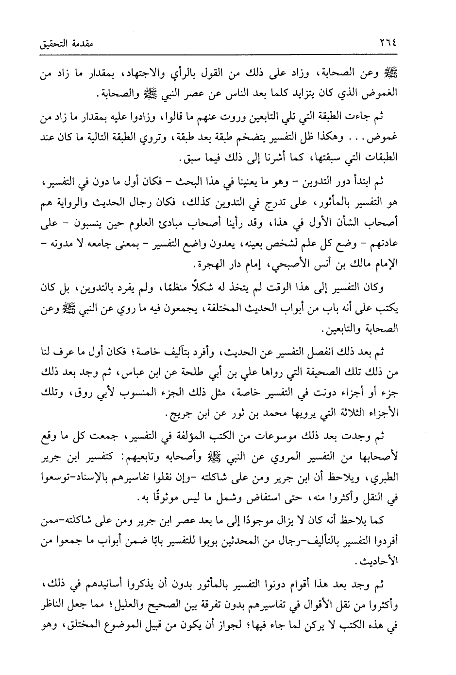ثم بعد ذلك انفصل التفسير عن الحديث، وأفرد بتآليف خاصة؛ فكان أول ما عرف لنا من ذلك تلك الصحيفة التي رواها علي بن أبي طلحة عن ابن عَبَّاسٍ، ثم وجد بعد ذلك جزء أو أجزاء دونت في التفسير خاصة، مثل ذلك الجزء المنسوب لأبي روق، وتلك الأجزاء الثلاثة التي يرويها مُحَمَّد بن ثور عن ابن جريج.