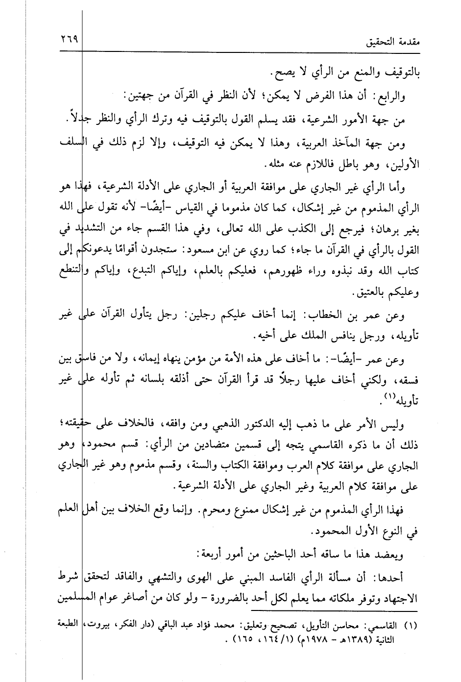 وليس الأمر على ما ذهب إليه الدكتور الذهبي ومن وافقه، فالخلاف على حقيقته؛ ذلك أن ما ذكره القاسمي يتجه إلى قسمين متضادين من الرأي: قسم محمود، وهو الجاري على موافقة كلام العرب وموافقة الكتاب والسنة، وقسم مذموم وهو غير الجاري على موافقة كلام العربية وغير الجاري على الأدلة الشرعية.