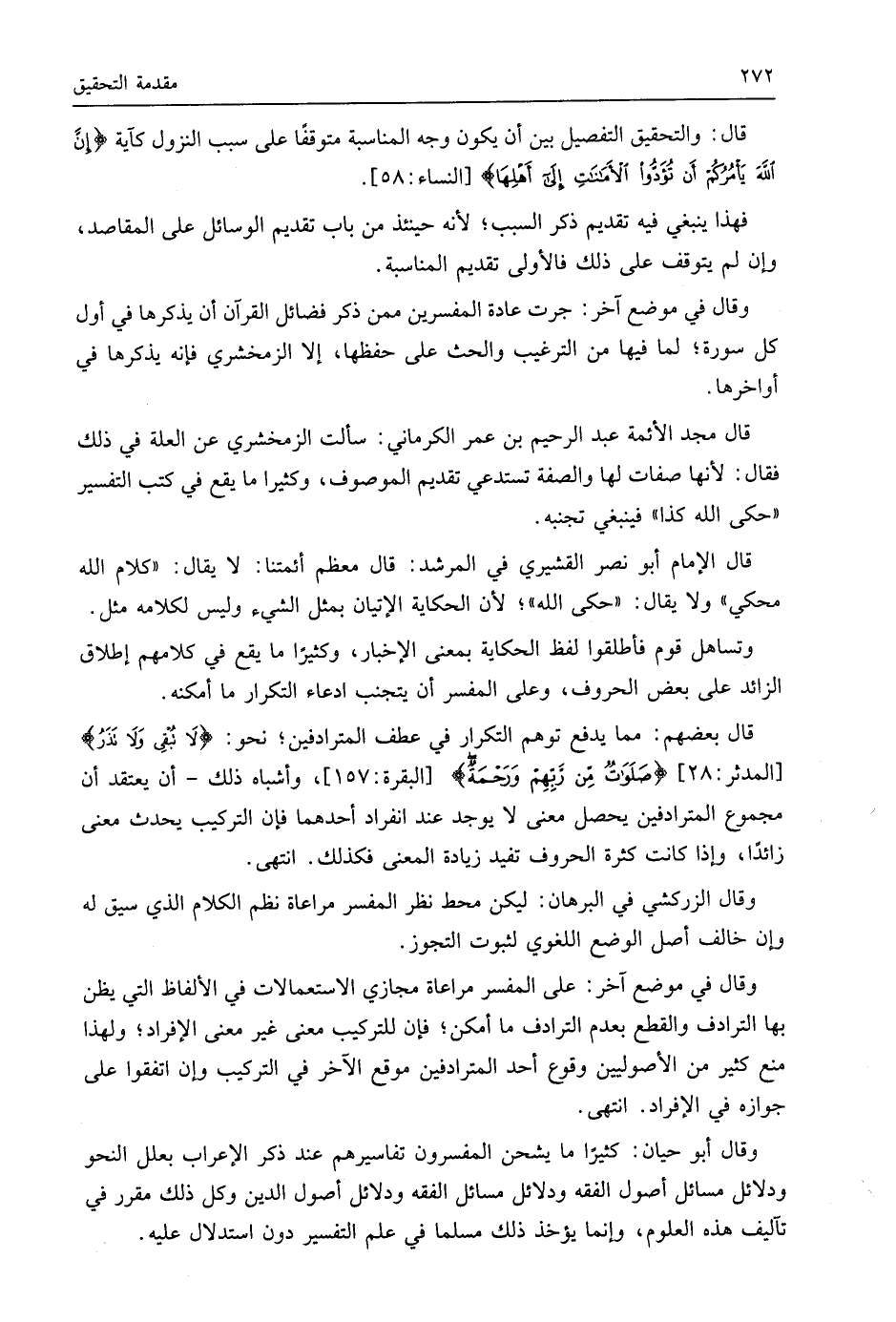 وقال في موضع آخر: على المفسر مراعاة مجازي الاستعمالات في الألفاظ التي يظن بها الترادف والقطع بعدم الترادف ما أمكن؛ فإن للتركيب معنى غير معنى الإفراد؛ ولهذا منع كثير من الأصوليين وقوع أحد المترادفين موقع الآخر في التركيب وإن اتفقوا على جوازه في الإفراد. انتهى.