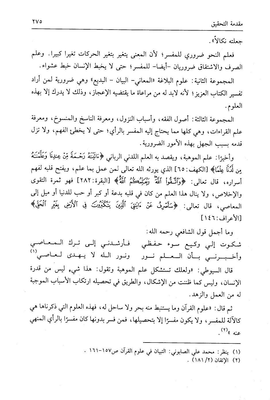المجموعة الثانية: علوم البلاغة " المعاني -البيان- البديع " وهي ضرورية لمن أراد تفسير الكتاب العزيز؛ لأنه لابد له من مراعاة ما يقتضيه الإعجاز، وذلك لا يدرك إلا بهذه العلوم.