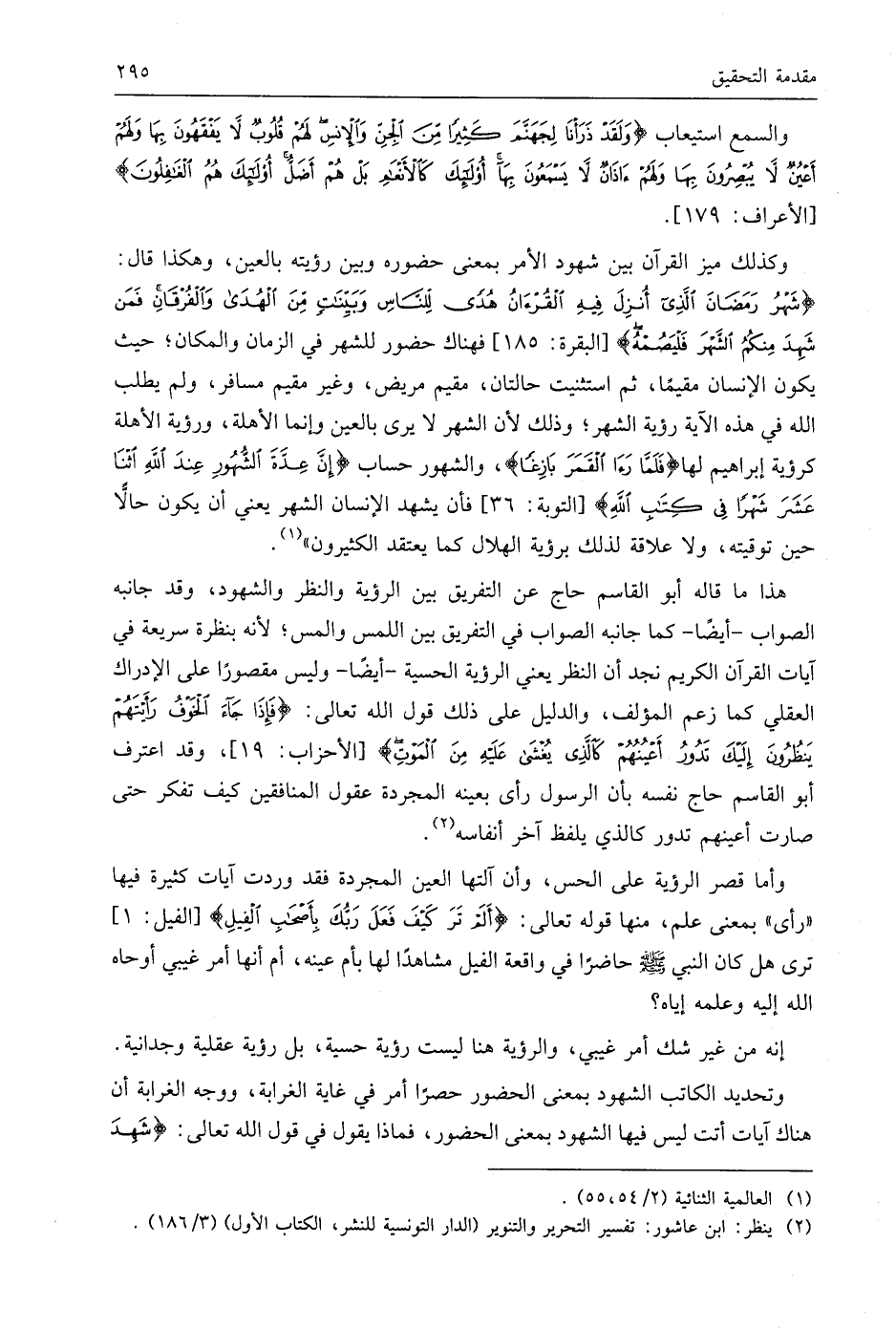 وكذلك ميز القرآن بين شهود الأمر بمعنى حضوره وبين رؤيته بالعين، وهكذا قال: (شَهْرُ رَمَضَانَ الَّذِي أُنْزِلَ فِيهِ الْقُرْآنُ هُدًى لِلنَّاسِ وَبَيِّنَاتٍ مِنَ الْهُدَى وَالْفُرْقَانِ فَمَنْ شَهِدَ مِنْكُمُ الشَّهْرَ فَلْيَصُمْهُ)، فهناك حضور للشهر في الزمان والمكان؛ حيث يكون الإنسان مقيمًا، ثم استثنيت حالتان، مقيم مريض، وغير مقيم مسافر، ولم يطلب اللَّه في هذه الآية رؤية الشهر؛ وذلك لأن الشهر لا يرى بالعين وإنما الأهلة، ورؤية الأهلة كرؤية إبراهيم لها (فَلَمَّا رَأَى الْقَمَرَ بَازِغًا)، والشهور حساب (إِنَّ عِدَّةَ الشُّهُورِ عِنْدَ اللَّهِ اثْنَا عَشَرَ شَهْرًا فِي كِتَابِ اللَّهِ)، فأن يشهد الإنسان الشهر يعني أن يكون حالًّا حين توقيته، ولا علاقة لذلك برؤية الهلال كما يعتقد الكثيرون ".