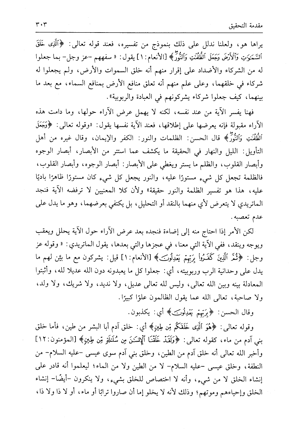 يراها هو، ولعلنا ندلل على ذلك بنموذج من تفسيره، فعند قوله تعالى: (الَّذِي خَلَقَ السَّمَاوَاتِ وَالْأَرْضَ وَجَعَلَ الظُّلُمَاتِ وَالنُّورَ)، يقول: " سفههم - عَزَّ وَجَلَّ - بما جعلوا له من الشركاء والأضداد على إقرار منهم أنه خلق السماوات والأرض، ولم يجعلوا له شركاء في خلقهما، وعلى علم منهم أنه تعلق منافع الأرض بمنافع السماء، مع بعد ما بينهما، كيف جعلوا شركاء يشركونهم في العبادة والربوبية ".