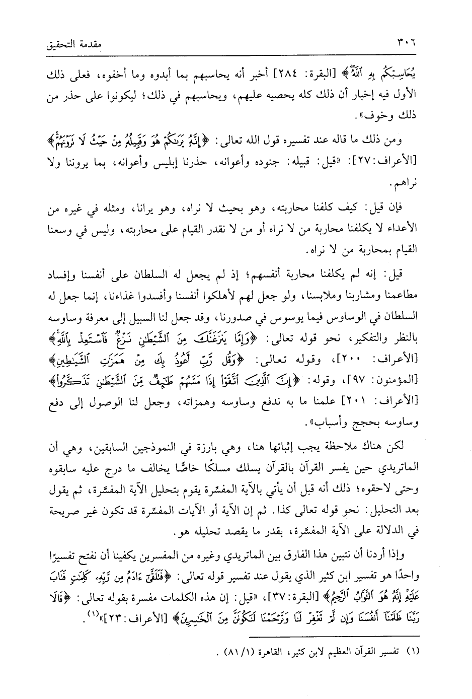 ومن ذلك ما قاله عند تفسيره قول اللَّه تعالى: (إِنَّهُ يَرَاكُمْ هُوَ وَقَبِيلُهُ مِنْ حَيْثُ لَا تَرَوْنَهُمْ) " قيل: قبيله: جنوده وأعوانه، حذرنا إبليس وأعوانه، بما يروننا ولا نراهم.