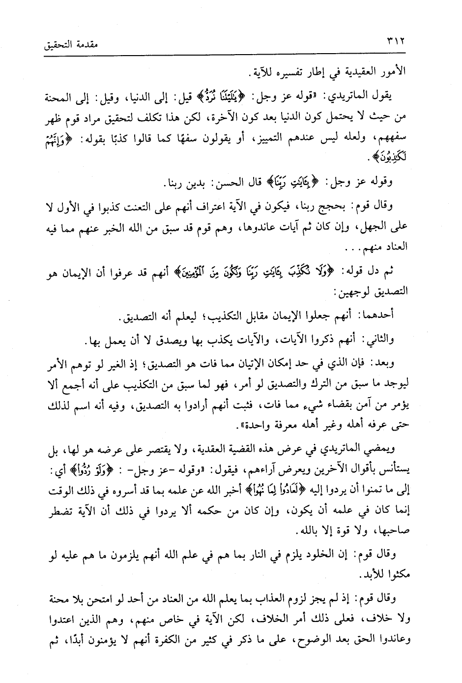 ويمضي الماتريدي في عرض هذه القضية العقدية، ولا يقتصر على عرضه هو لها، بل يستأنس بأقوال الآخرين ويعرض آراءهم، فيقول: " وقوله - عَزَّ وَجَلَّ -: (وَلَوْ رُدُّوا) أي: إلى ما تمنوا أن يردوا إليه (لَعَادُوا لِمَا نُهُوا) أخبر اللَّه عن علمه بما قد أسروه في ذلك الوقت إنما كان في علمه أن يكون، وإن كان من حكمه ألا يردوا في ذلك أن الآية تضطر صاحبها، ولا قوة إلا باللَّه.