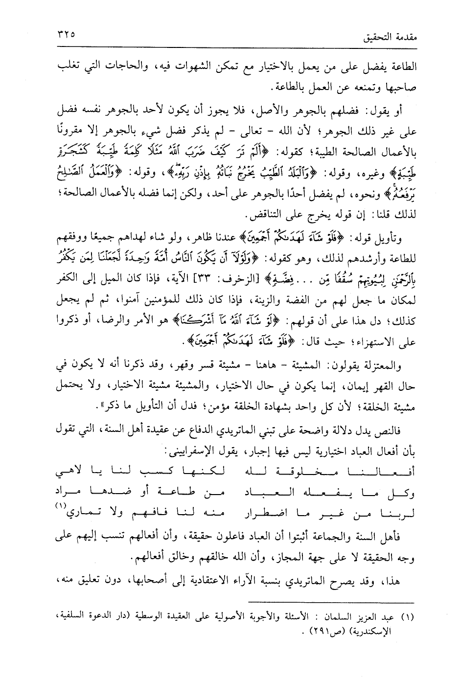 فالنص يدل دلالة واضحة على تبني الماتريدي الدفاع عن عقيدة أهل السنة، التي تقول بأن أفعال العباد اختيارية ليس فيها إجبار، يقول الإسفراييني: