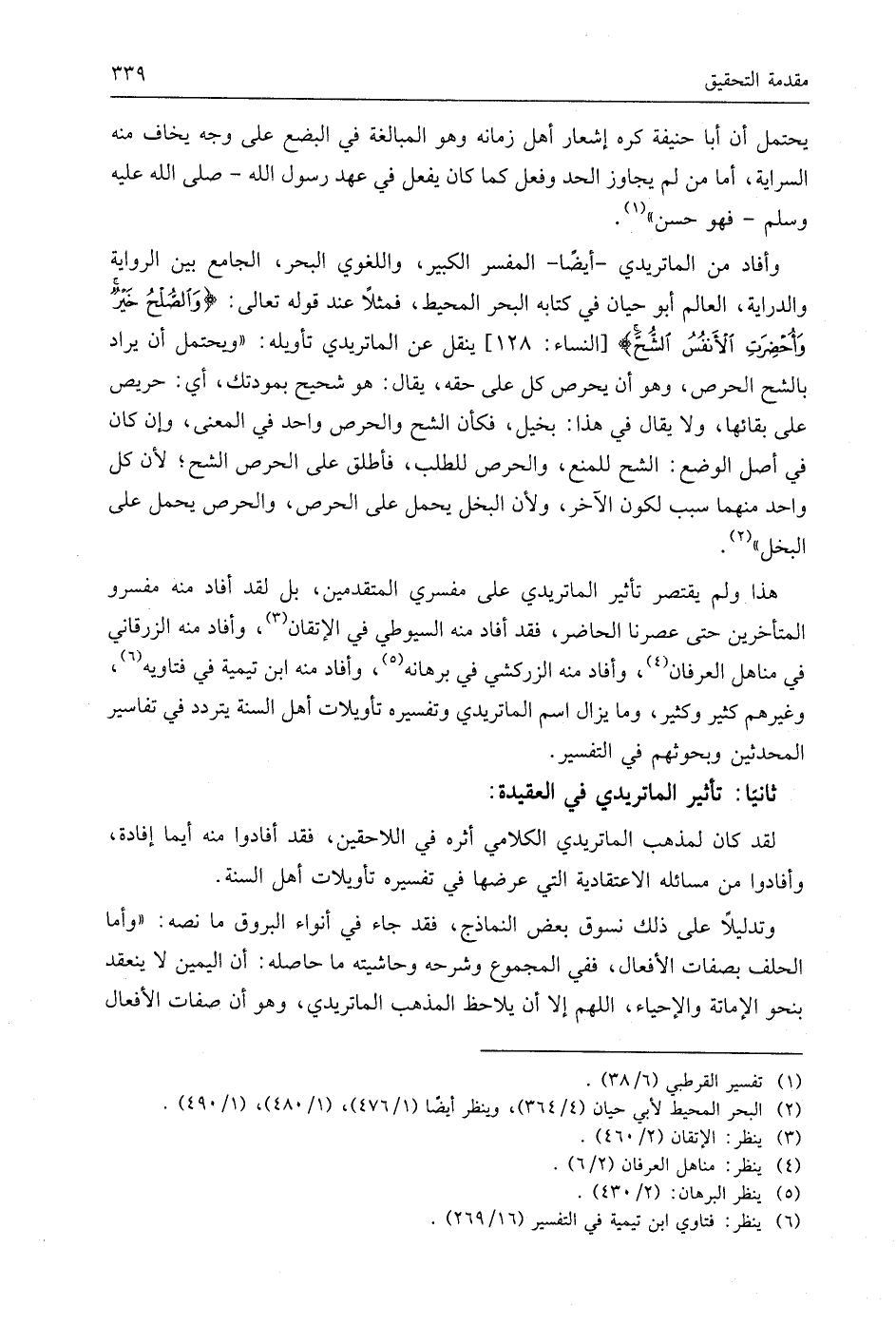 وأفاد من الماتريدي -أيضًا- المفسر الكبير، واللغوي البحر، الجامع بين الرواية والدراية، العالم أبو حيان في كتابه البحر المحيط، فمثلاً عند قوله تعالى: (وَالصُّلْحُ خَيْرٌ وَأُحْضِرَتِ الْأَنْفُسُ الشُّحَّ)، ينقل عن الماتريدي تأويله: " ويحتمل أن يراد بالشح الحرص، وهو أن يحرص كل على حقه، يقال: هو شحيح بمودتك، أي: حريص على بقائها، ولا يقال في هذا: بخيل، فكأن الشح والحرص واحد في المعنى، وإن كان في أصل الوضع: الشح للمنع، والحرص للطلب، فأطلق على الحرص الشح؛ لأن كل واحد منهما سبب لكون الآخر، ولأن البخل يحمل على الحرص، والحرص يحمل على البخل ".