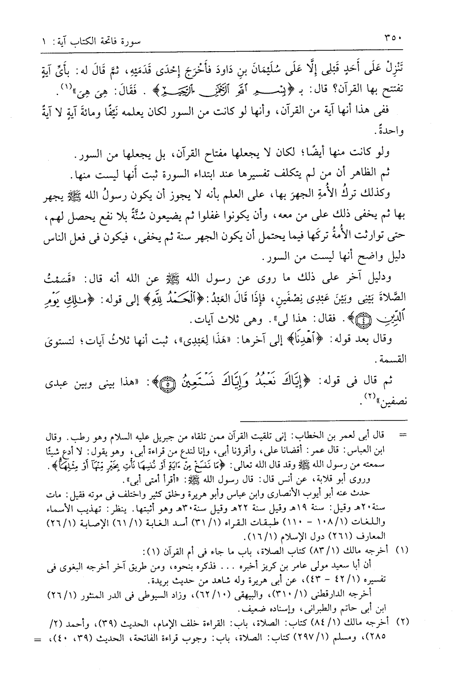 ودليل آخر على ذلك ما رُويَ عن رسول اللَّه - صَلَّى اللَّهُ عَلَيهِ وَسَلَّمَ - عن اللَّه أنه قال: " قَسَمْتُ الصَّلاةَ بَيْنِي وبَينَ عَبدِي نِصْفَينِ، فإِذَا قَالَ العَبدُ: (الْحَمْدُ لِلَّهِ) إلى قوله: (مَالِكِ يَوْمِ الدِّينِ). فقال: هذا لي ". وهي ثلاث آيات.