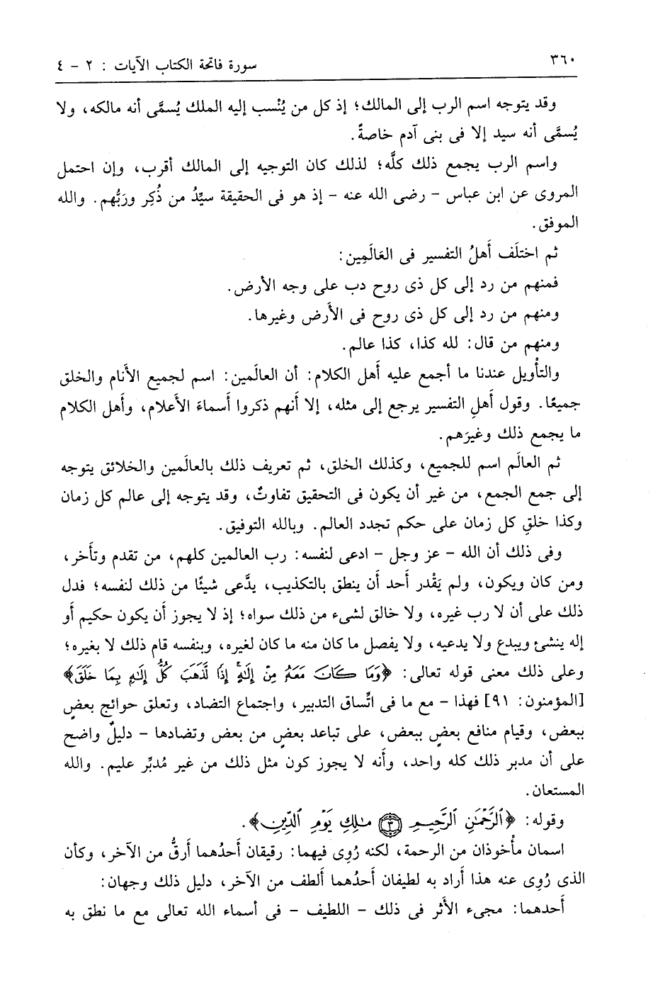 والتأويل عندنا ما أجمع عليه أهل الكلام: أن العالَمين: اسم لجميع الأَنام والخلق جميعًا. وقول أَهلِ التفسير يرجع إلى مثله، إلا أَنهم ذكروا أَسماءَ الأَعلام، وأَهل الكلام ما يجمع ذلك وغيرَهم.