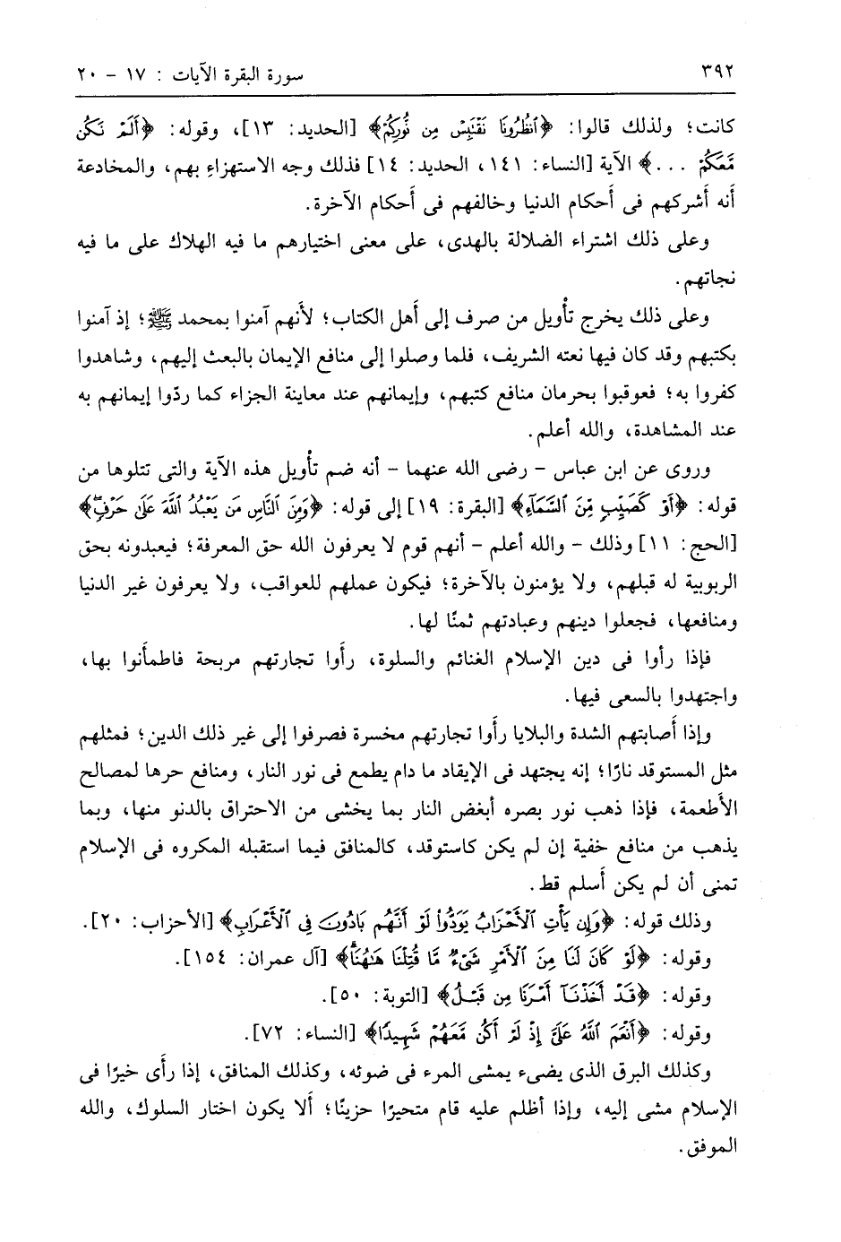 ورُويَ عن ابن عَبَّاسٍ - رضي اللَّه عنهما - أنه ضم تأويل هذه الآية والتي تتلوها من قوله: (أَوْ كَصَيِّبٍ مِنَ السَّمَاءِ) إلى قوله: (وَمِنَ النَّاسِ مَنْ يَعْبُدُ اللَّهَ عَلَى حَرْفٍ) وذلك - واللَّه أعلم - أنهم قوم لا يعرفون اللَّه حق المعرفة؛ فيعبدونه بحق الربوبية له قبلهم، ولا يؤمنون بالآخرة؛ فيكون عملهم للعواقب، ولا يعرفون غير الدنيا ومنافعها، فجعلوا دينهم وعبادتهم ثمنًا لها.