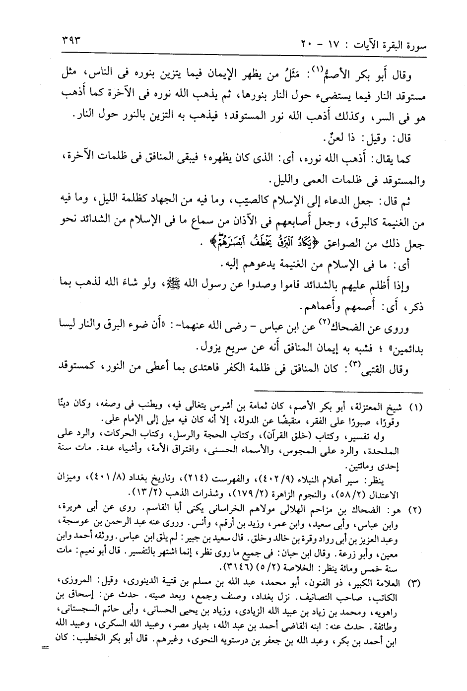 ورُويَ عن الضحاك عن ابن عَبَّاسٍ - رضي اللَّه عنهما -: " أن ضوء البرق والنار ليسا بدائمين "؛ فشبه به إيمان المنافق أَنه عن سريع يزول.