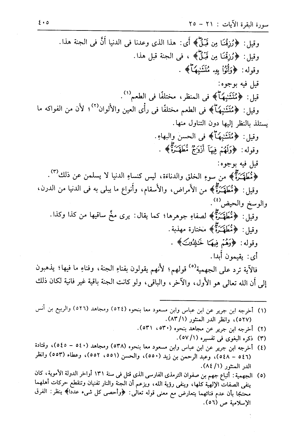 وقيل: (مُتَشَابِهًا) في الطعم مختلفًا في رأي العين والأَلوان؛ لأَن من الفواكه ما يستلذ بالنظر إليها دون التناول منها.