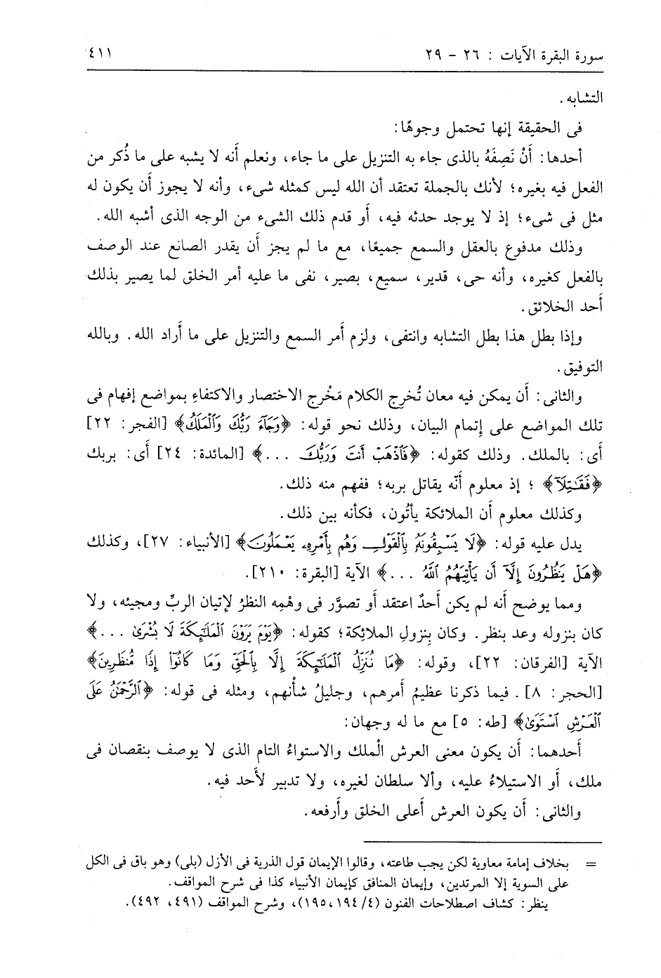 ومما يوضح أَنه لم يكن أَحدٌ اعتقد أَو تصوَّر في وهْمِه النظرُ لإتيان الربِّ ومجيئه، ولا كان بنزوله وعد بنظر. وكان بِنزولِ الملائِكة؛ كقوله: (يَوْمَ يَرَوْنَ الْمَلَائِكَةَ لَا بُشْرَى. . .)، وقوله: (مَا نُنَزِّلُ الْمَلَائِكَةَ إِلَّا بِالْحَقِّ وَمَا كَانُوا إِذًا مُنْظَرِينَ) فيما ذكرنا عظيمُ أَمرهم، وجليلُ شأْنهم، ومثله في قوله: (الرَّحْمَنُ عَلَى الْعَرشِ اسْتَوَى)، مع ما له وجهان: