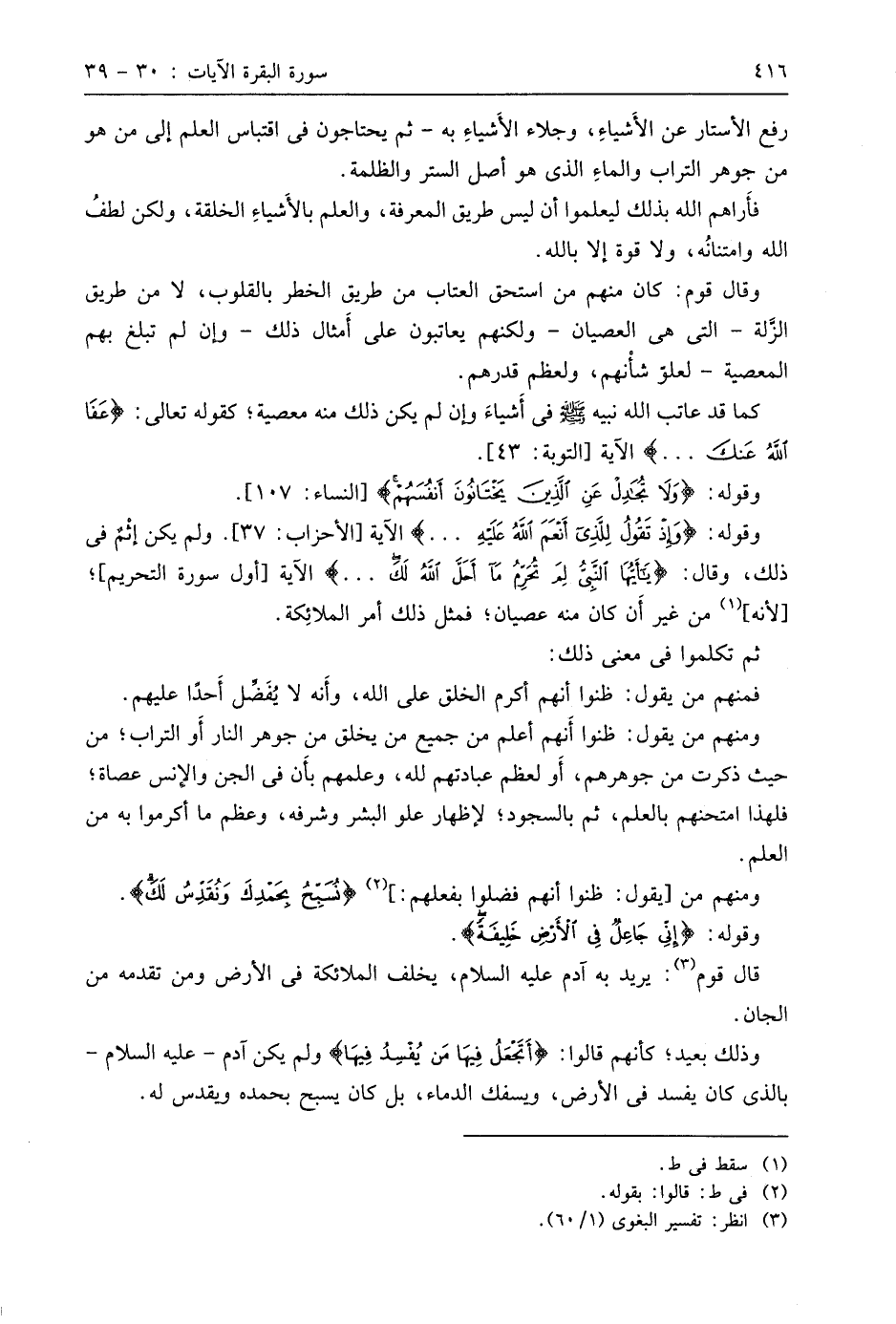 ومنهم من يقول: ظنوا أَنهم أعلم من جميع من يخلق من جوهر النار أَو التراب؛ من حيث ذكرت من جوهرهم، أَو لعظم عبادتهم لله، وعلمهم بأن في الجن والإنس عصاة؛ فلهذا امتحنهم بالعلم، ثم بالسجود؛ لإظهار علو البشر وشرفه، وعظم ما أكرموا به من العلم.
