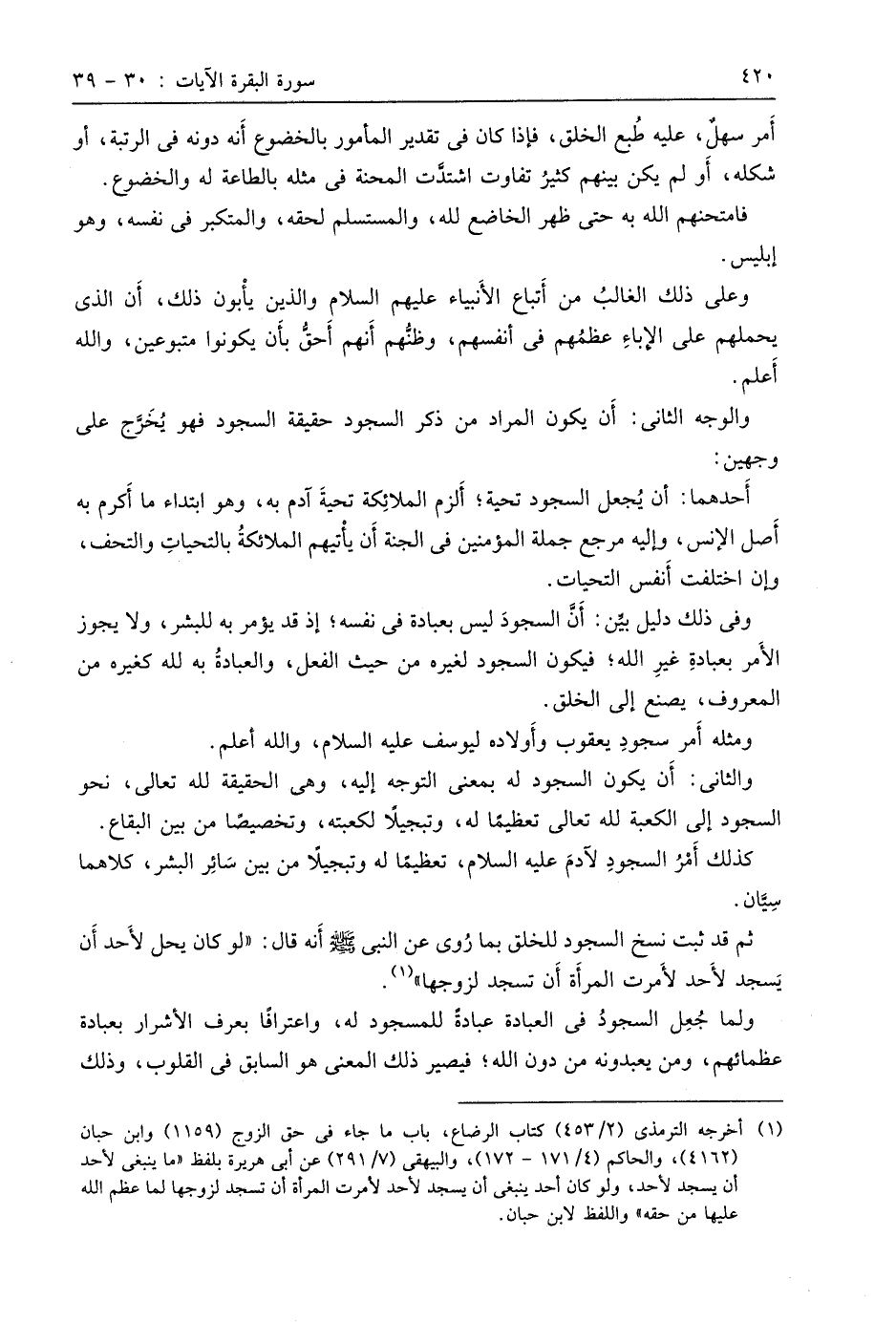 أَحدهما: أن يُجعل السجود تحية؛ أَلزم الملائِكة تحيةَ آدم به، وهو ابتداء ما أَكرم به أَصل الإنس، وإليه مرجع جملة المؤمنين في الجنة أن يأتيهم الملائكةُ بالتحياتِ والتحف، وإن اختلفت أَنفس التحيات.