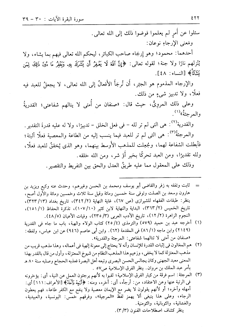 والمرجئة: هي التي لم تر للعبد فيما ينسب إليه من الطاعة والمعصية فعلًا ألبتَّة؛ فأبطلت الشفاعة لهما، وجُعِلت للمذهب الأوسط بينهما، وهو الذي يُحَققُ للعبد فعلًا، ولله تقديرًا، ومن العبد تحركًا بخير أَوْ شر، ومن اللَّه خلقه.