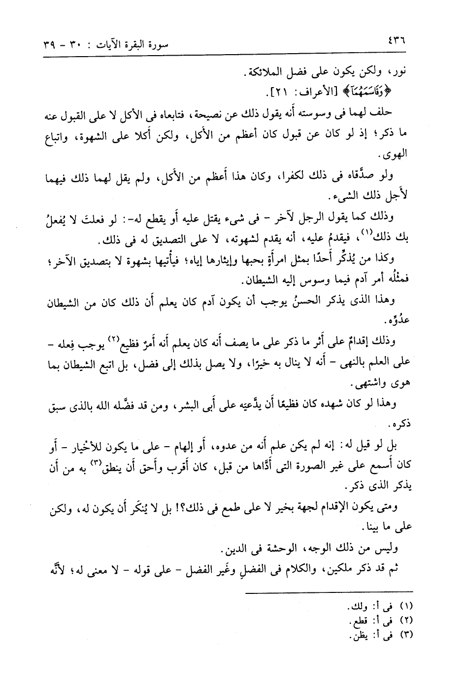 وكذا من يُذكر أَحدًا بمثل امرأَةٍ بحبها وإيثارها إياه؛ فيأتيها بشهوة لا بتصديق الآخر؛ فمثْلُه أمر آدم فيما وسوس إليه الشيطان.