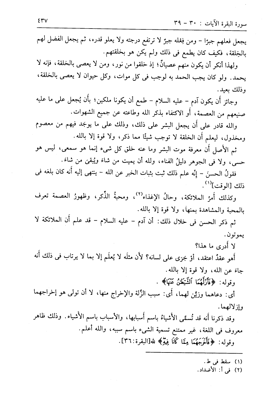 وجائز أَن يكون آدم - عليه السلام - طمع أن يكونا ملكين؛ بأَن يُجعل على ما عليه صنيعهم من العصمة، أَو الاكتفاء بذكر اللَّه وطاعته عن جميع الشهوات.