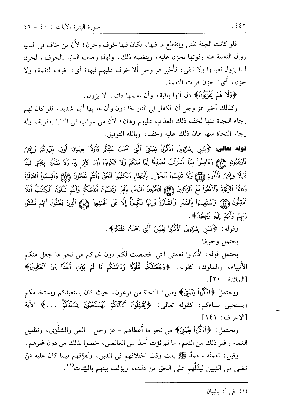 قوله تعالى (يَا بَنِي إِسْرَائِيلَ اذْكُرُوا نِعْمَتِيَ الَّتِي أَنْعَمْتُ عَلَيْكُمْ وَأَوْفُوا بِعَهْدِي أُوفِ بِعَهْدِكُمْ وَإِيَّايَ فَارْهَبُونِ (40) وَآمِنُوا بِمَا أَنْزَلْتُ مُصَدِّقًا لِمَا مَعَكُمْ وَلَا تَكُونُوا أَوَّلَ كَافِرٍ بِهِ وَلَا تَشْتَرُوا بِآيَاتِي ثَمَنًا قَلِيلًا وَإِيَّايَ فَاتَّقُونِ (41) وَلَا تَلْبِسُوا الْحَقَّ بِالْبَاطِلِ وَتَكْتُمُوا الْحَقَّ وَأَنْتُمْ تَعْلَمُونَ (42) وَأَقِيمُوا الصَّلَاةَ وَآتُوا الزَّكَاةَ وَارْكَعُوا مَعَ الرَّاكِعِينَ (43) أَتَأْمُرُونَ النَّاسَ بِالْبِرِّ وَتَنْسَوْنَ أَنْفُسَكُمْ وَأَنْتُمْ تَتْلُونَ الْكِتَابَ أَفَلَا تَعْقِلُونَ (44) وَاسْتَعِينُوا بِالصَّبْرِ وَالصَّلَاةِ وَإِنَّهَا لَكَبِيرَةٌ إِلَّا عَلَى الْخَاشِعِينَ (45) الَّذِينَ يَظُنُّونَ أَنَّهُمْ مُلَاقُو رَبِّهِمْ وَأَنَّهُمْ إِلَيْهِ رَاجِعُونَ (46).