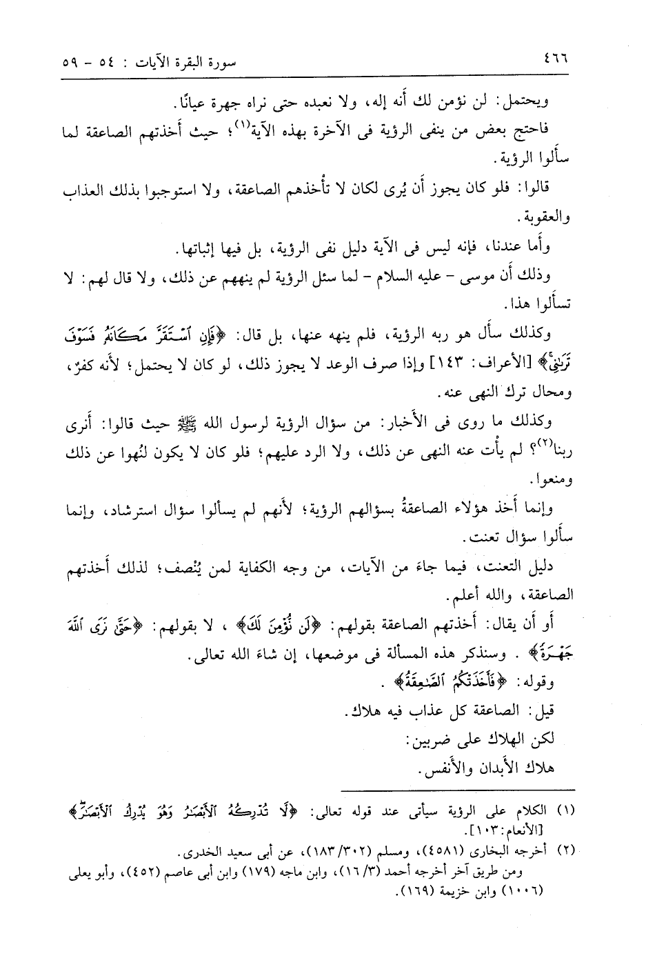 فاحتج بعض من ينفي الرؤية في الآخرة بهذه الآية؛ حيث أَخذتهم الصاعقة لما سأَلوا الرؤية.